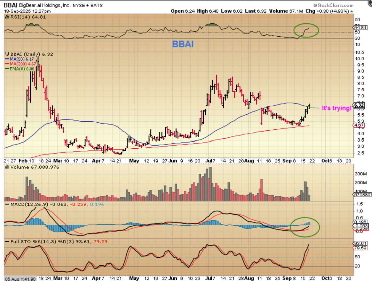BBAI was a buy at the 200sma reversal. Many of us bought it when I posted 2 days later that it was stalling but bullish and had growing volume. The next obstacle was likely that 50sma, so today I pointed out that it was trying to break it, rather than bounce off and dip like they often do.