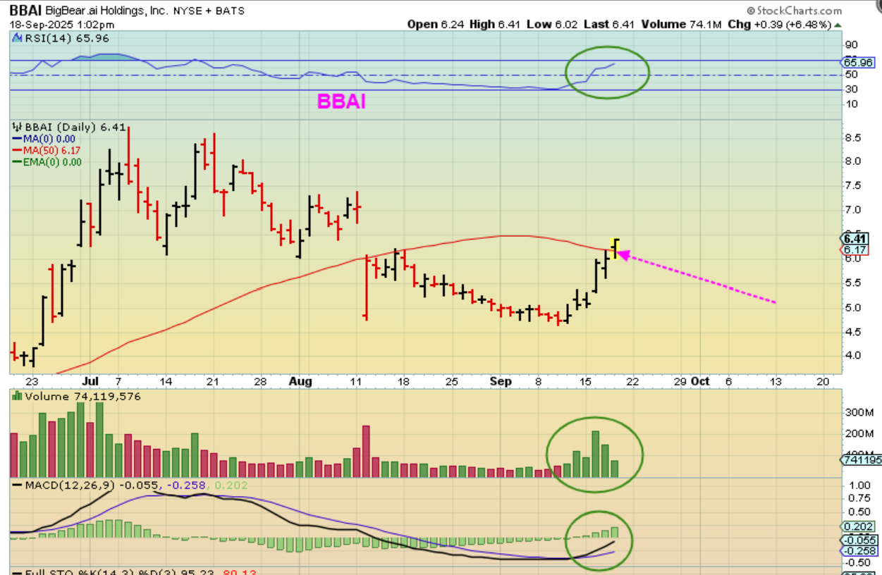 BBAI – Shortly after that, it was breaking through and looked good, up 6.5%. Well, it did dip into the end of the day as the markets sold off, but it was still up 4% and over the 50sma, so at this point, it may just continue higher, especially if the markets do. Also, the 50sma could be a place to add if it stabilizes there, with a stop on that extra portion.