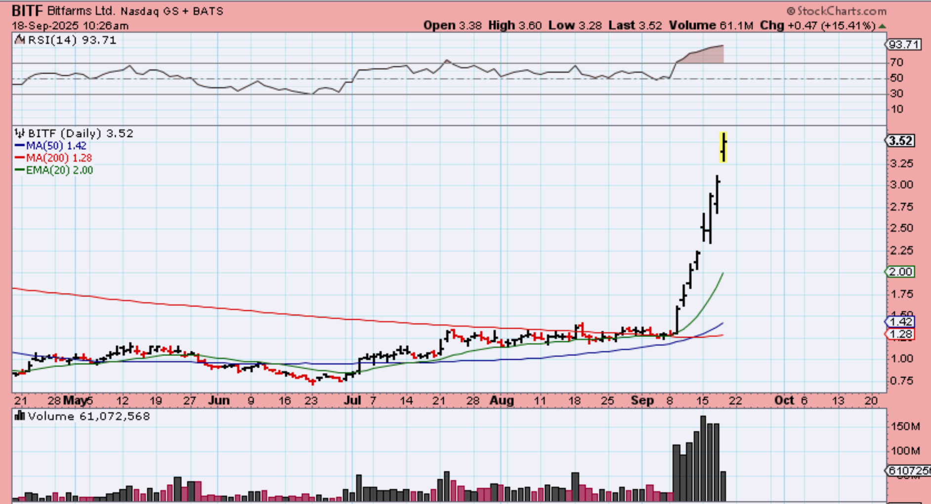 BITF was a ‘buy’ at the $1.25 area and it has almost tripled in 8 days! It is a rocket ship, but these do usually pull back swiftly when the buying slows up and the profit takers hit the exits. AWESOME Trade so far though!