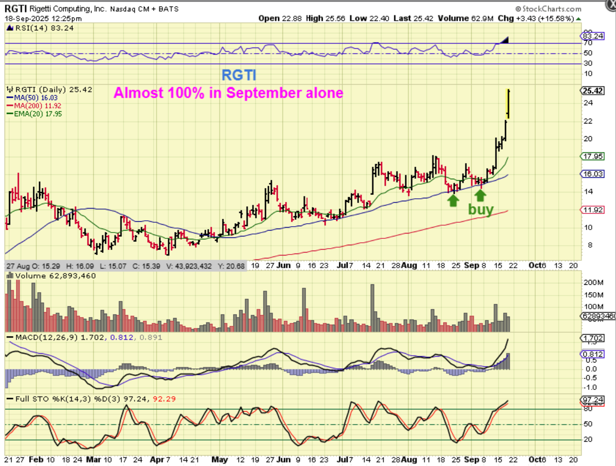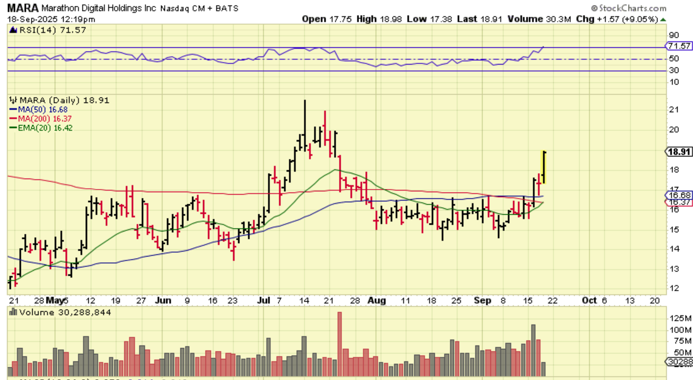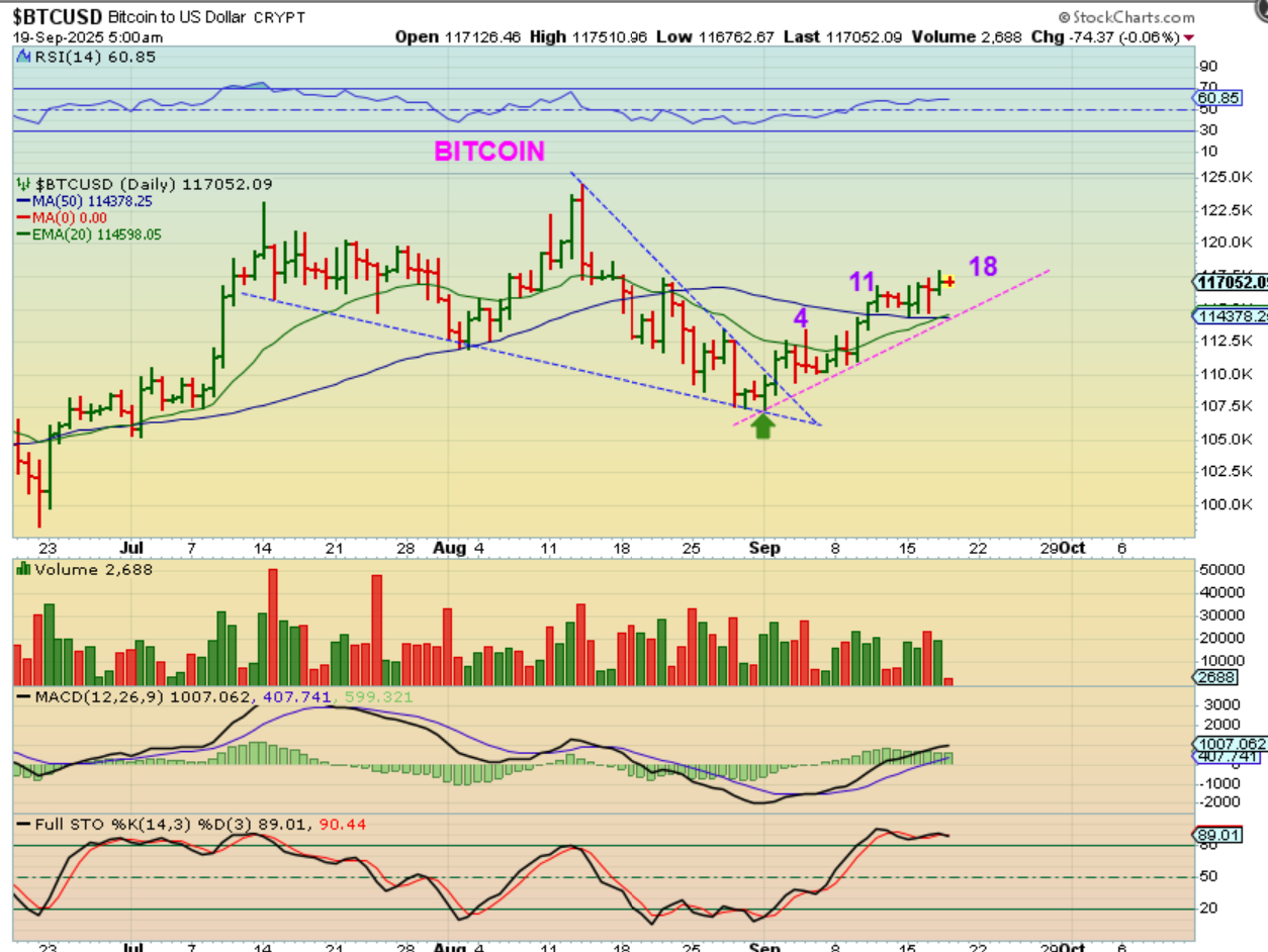Everything survived the Fed Day Rate Cut, and some areas continued to rally strongly. Timing for the general markets is getting a little late (day 33), but they can run long at times, so we may still run higher. The USD is bouncing, and the Precious Metals sector has stalled at this point. We may be due for a dip, but it could be mild and choppy sideways too, we’ll see. Bitcoin moved higher and Crypto Stocks are still acting well. Some are Extremely Bullish, others are nicely trending higher. A few laggers joined in too, so I’ll cover that below. Enjoy your Friday trading and upcoming weekend!