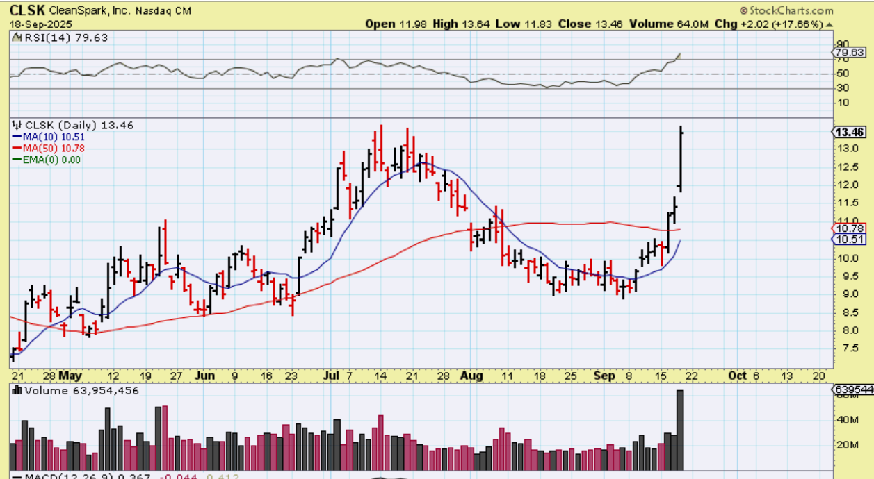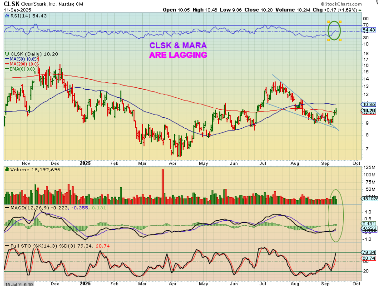 CLSK – I shared this chart on September 11th last week. It broke the wedge, got above the 200sma, RSI was over 50, MACD crossed, so it looked to be ready to participate.