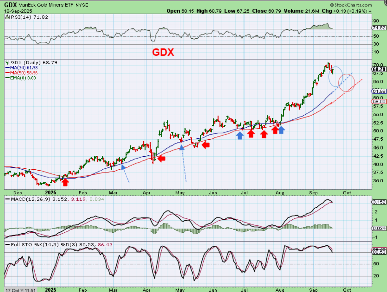 GDX certainly had a strong run, and it may be ready for a rest too. During the choppier times this year, price always seemed to bounce around the 34 sma and the 50sma, so I drew those on as possible targets.
