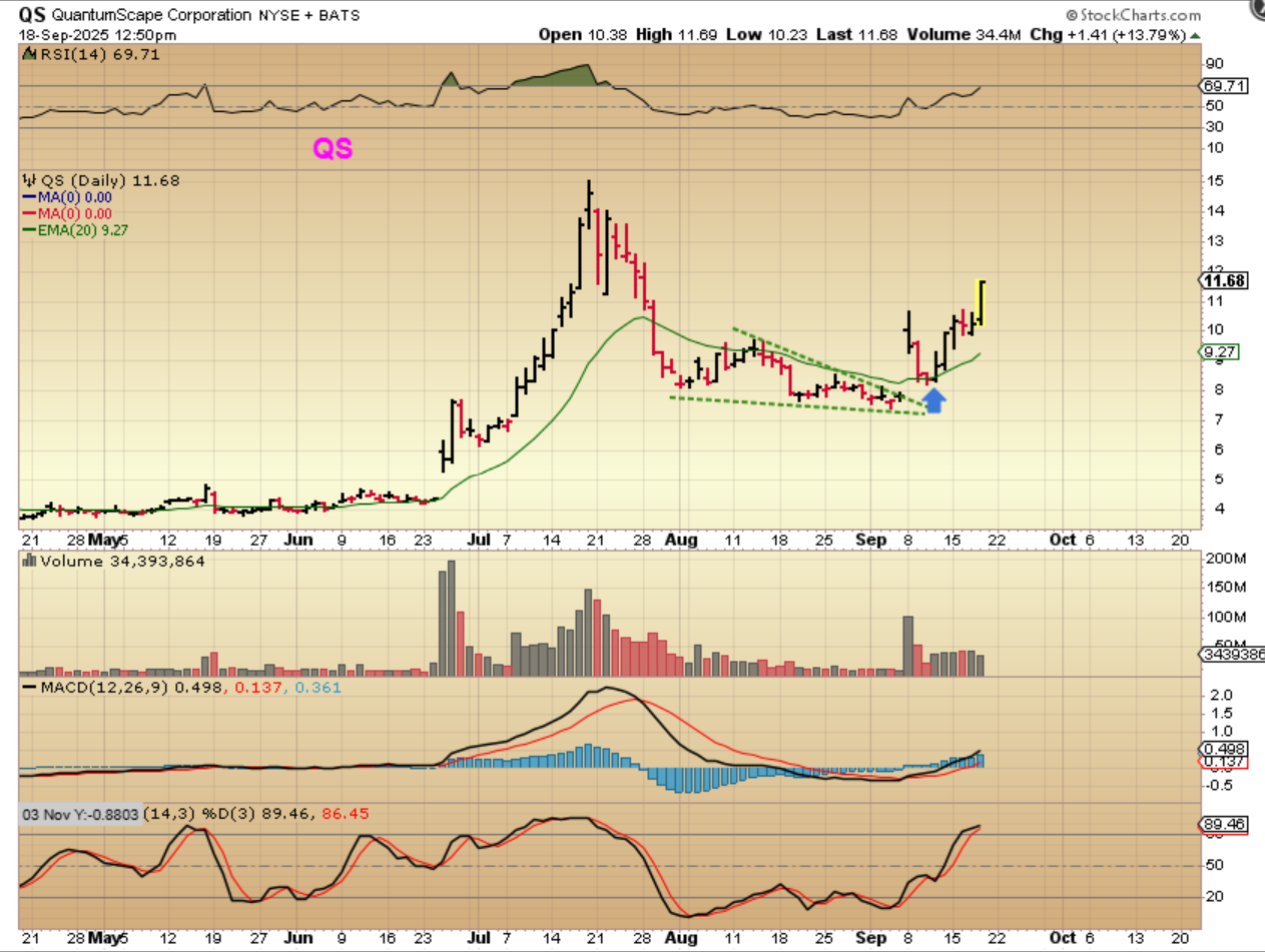 QS continued higher and was up almost 14% at $11.68 when I grabbed this at midday. It actually almost closed up 20%, over $12, so congrats if you took this trade.