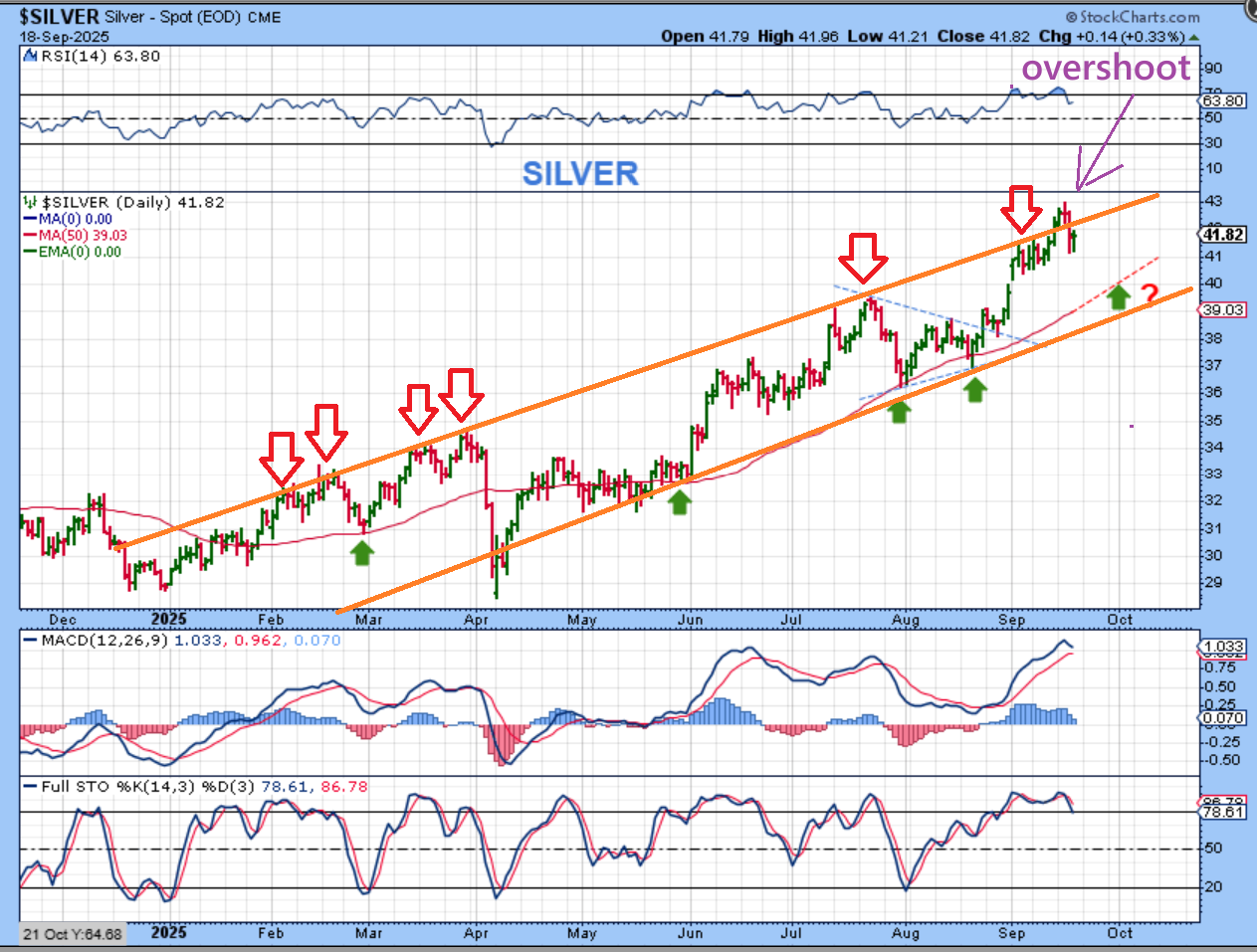SILVER – This channel seems to call for a dip too, doesn’t it? NOTE: This may be choppy because in this bull market, surprises have been to the upside!