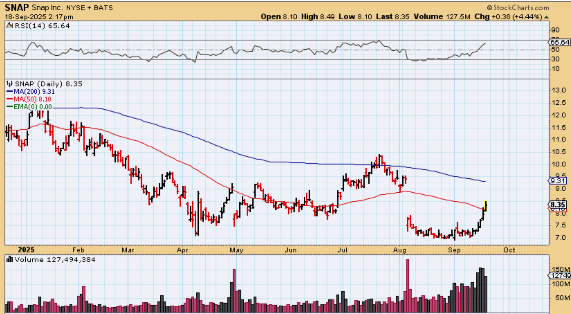 SNAP got crushed on earnings in August, but after basing out, it started to rally last week. I’m impressed by the strong volume helping this recovery, but some of this could be ‘short-covering’. You could buy this as it breaks the 50sma, and it can keep running, but this is only 1 reason why I am pointing this out.
