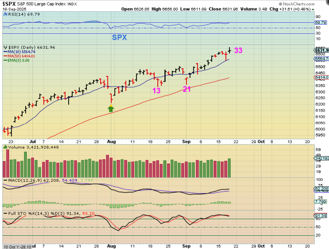 SPX – The day after the rate cut saw the markets gap up and then a small rally brought it higher, but it couldn’t hold the highs. That’s ok, we didn’t crash. We’re now on day 33, and it looks like it’ll just be normal market action going forward. The markets have been doing well.