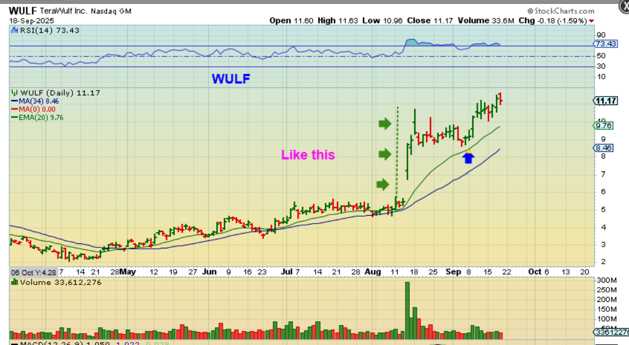 NOTE: You may sell some and then it just bull flags, forms a high pennant, or go sideways and let the moving averages catch up, like WULF. Usually if it does though, you can always get back in as it reaches the 20ema or reverses higher with increasing volume.