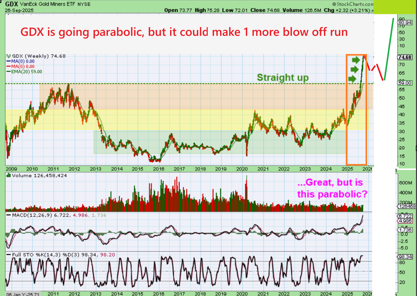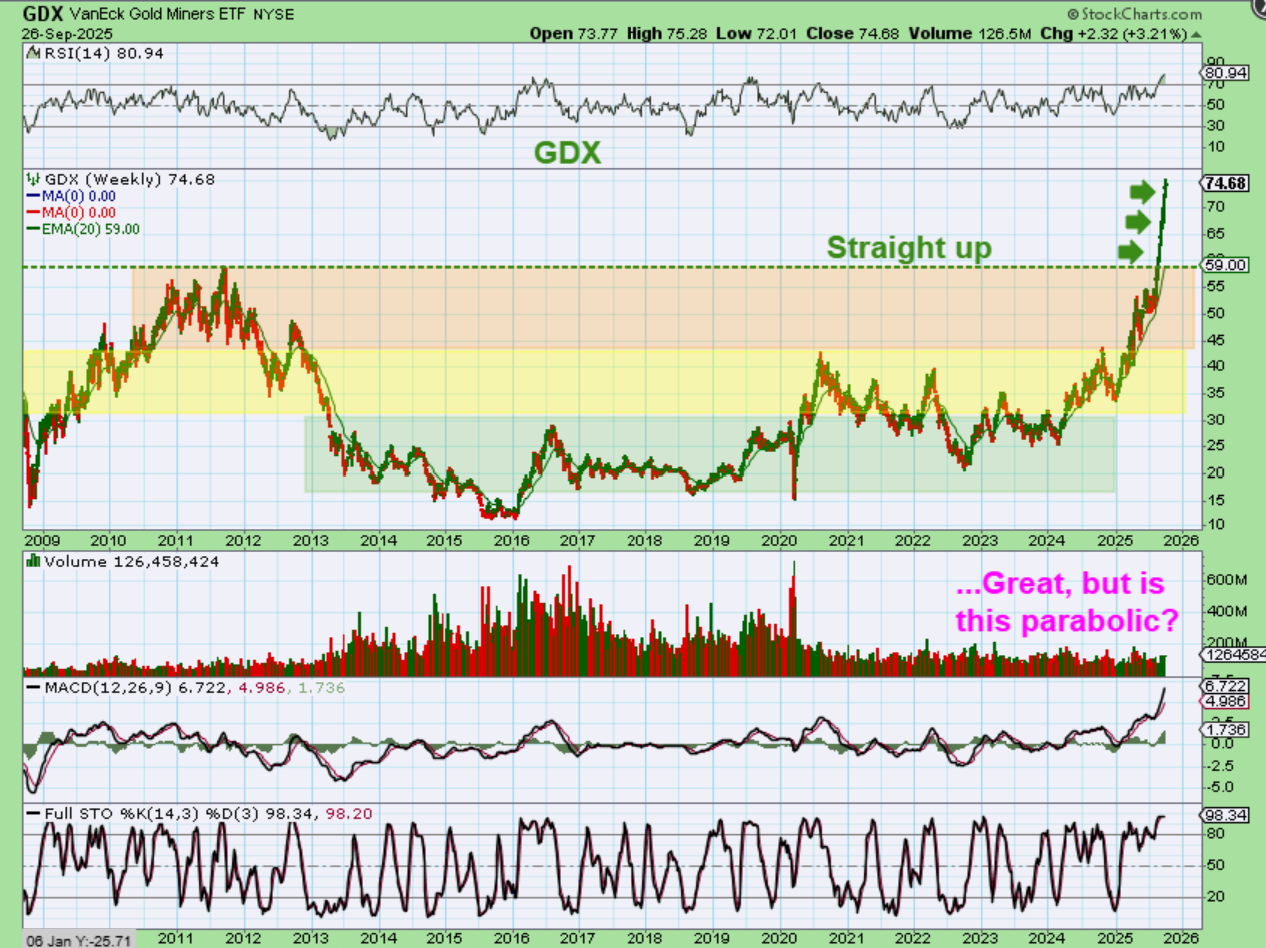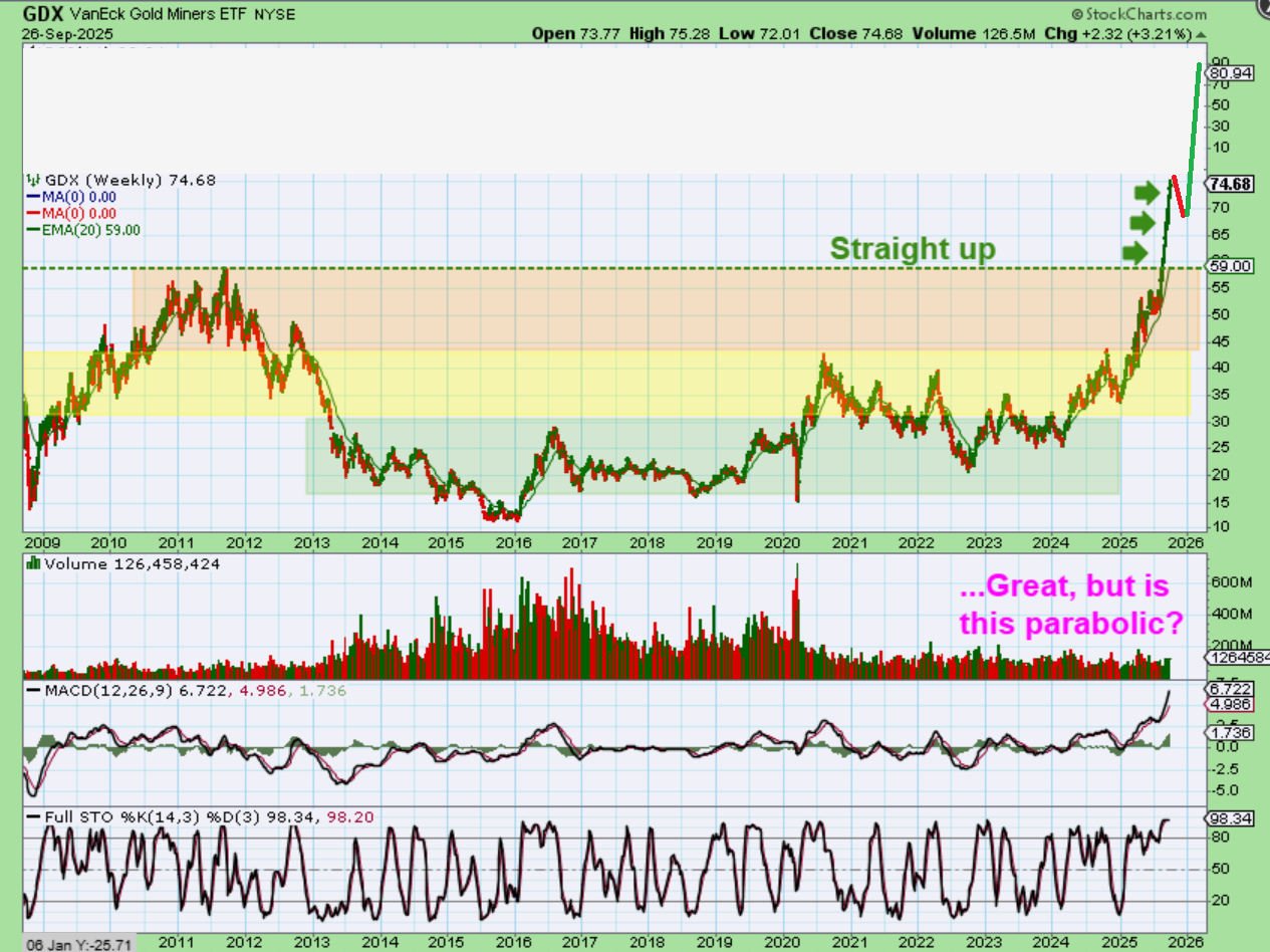 Once the GDX broke to new all-time highs, it had no resistance. I had been pointing that out with these colored charts of GDX resistance areas. Now that it broke out, it has been on a tear! I am slightly concerned with the GDX straight up rally though, because parabolic moves like that can become exhausted blow off tops that crash. I’d love to see GDX start to consolidate (maybe in October) and form a triangle like Gold does. THAT would become a strong buy for Miners as they dip lower, and then they might give a final blow off top into the year-end or beginning of 2026.