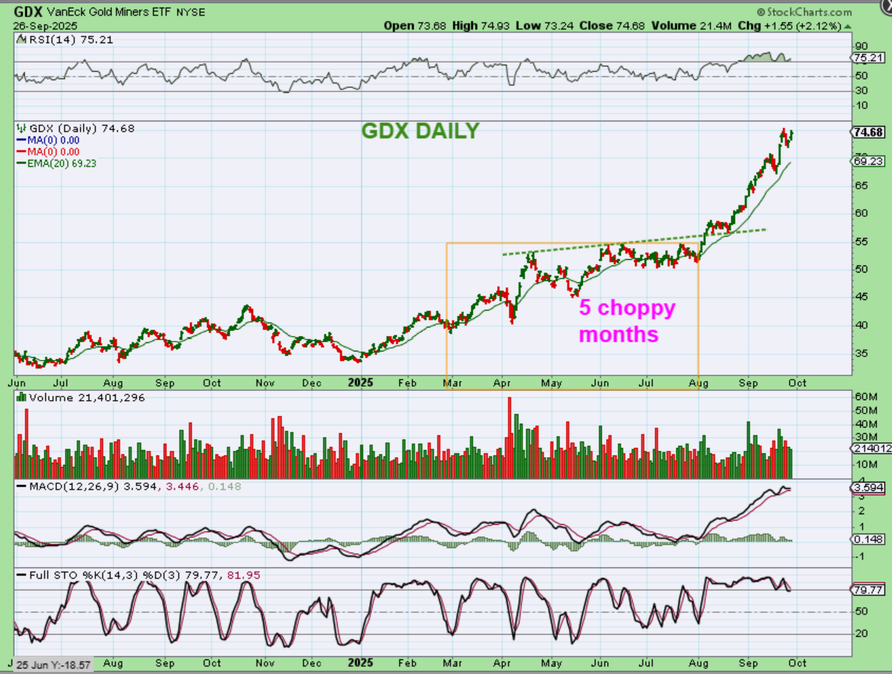 Next I will show you something that was a bit surprising . I want you to notice how choppy and difficult GDX was for 5 months in 2025. It would run up and then sell off, especially those dips in April and May. in June and July it was all sideways Chop, Chop, Chop. Now keep that in mind…