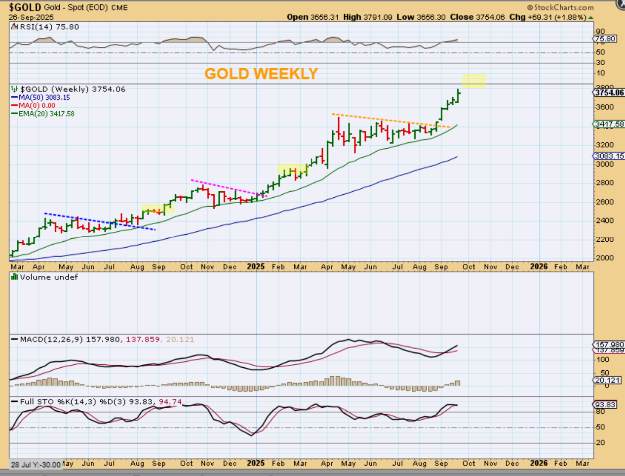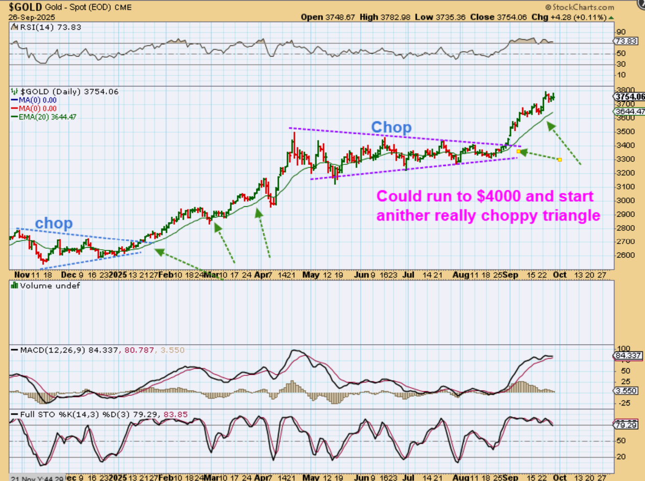 GOLD DAILY – Out of the triangles we get a slightly choppy run at first, and then it gets more choppy and starts to form another triangle. So it does make me wonder if Gold will run to a round number like $4000 and then give us another triangle consolidation.