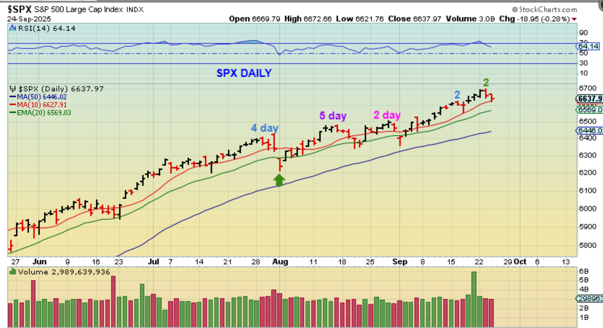 SPX DAILY – We got our reversal, so is this Day 39 with another bounce and a drop into a dcl near day 50? Or was this a 3 day dip into a dcl, that is very mild? We don’t really know, but so far the dips have been mild. We stay long above the 20ema. THAT was a choppy end to the week (3 day drops).