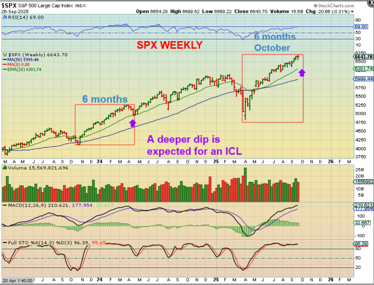 SPX WEEKLY– We are really coming due for an ICL drop being 6 months out from the April ICL, so I have been saying that we may get a Sell off October. That has happened in the past – we have seen October crashes. From there that drop could be down to the green 20 week ma. Take a look at how that first orange box ended. It had a 3 week drop, so…