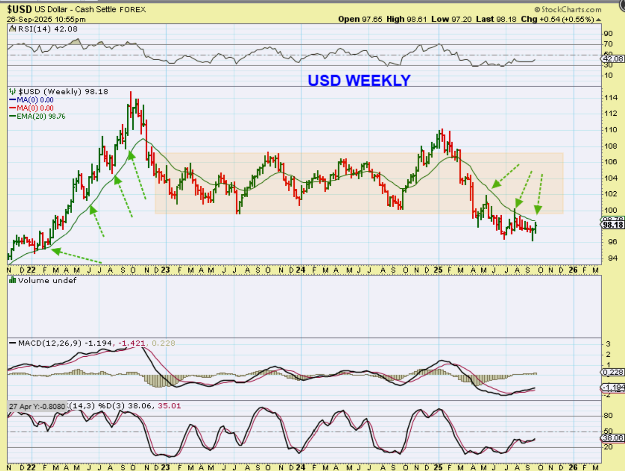THE USD has a weekly swing low and had a good week, but that didn’t hinder Gold and Silver, so that was interesting to take note of. The USD has been bumping on and rejected at the green 20 week ema, so we’ll see if it can break through next week…or not. The MACD is bullish.