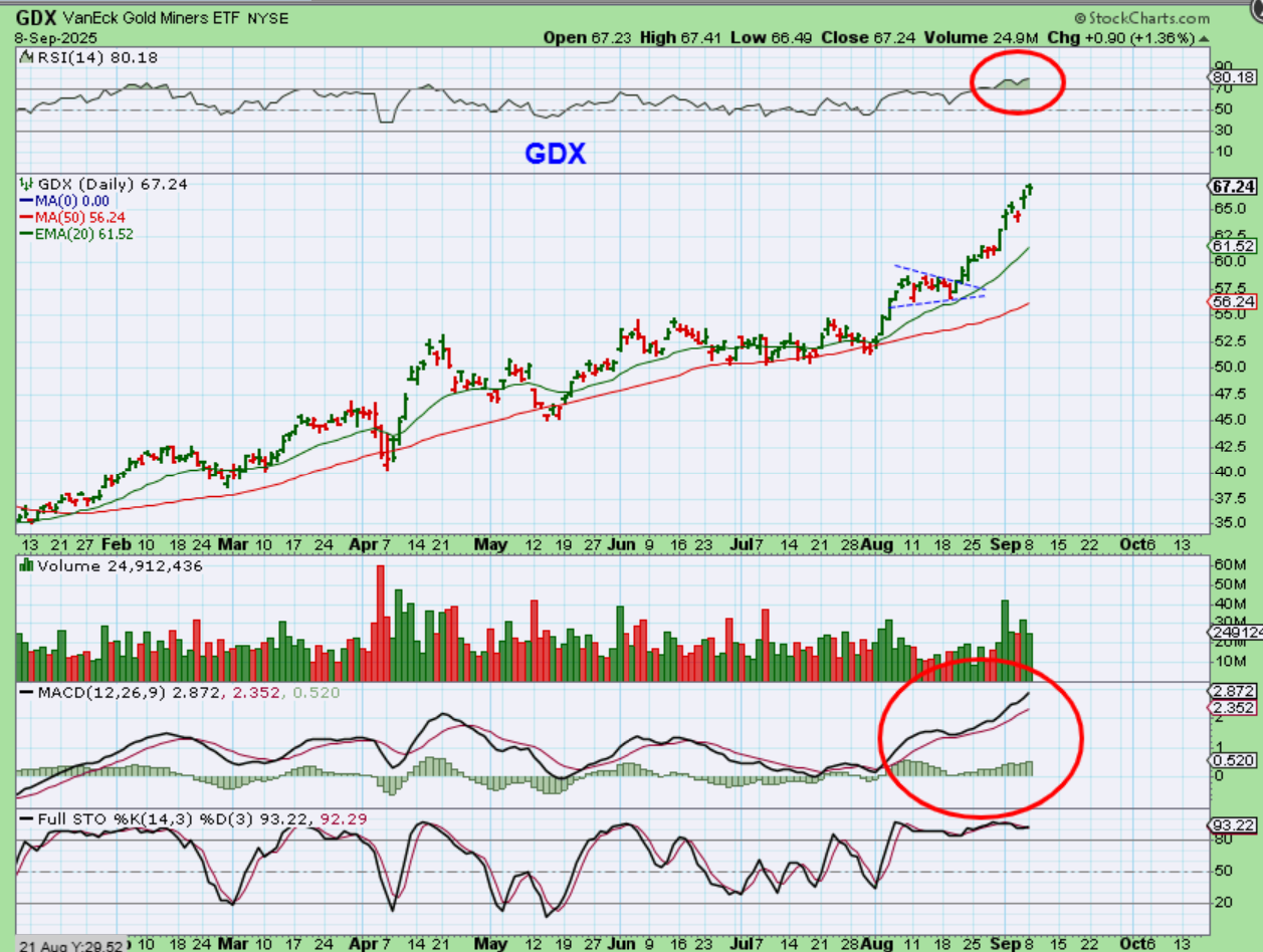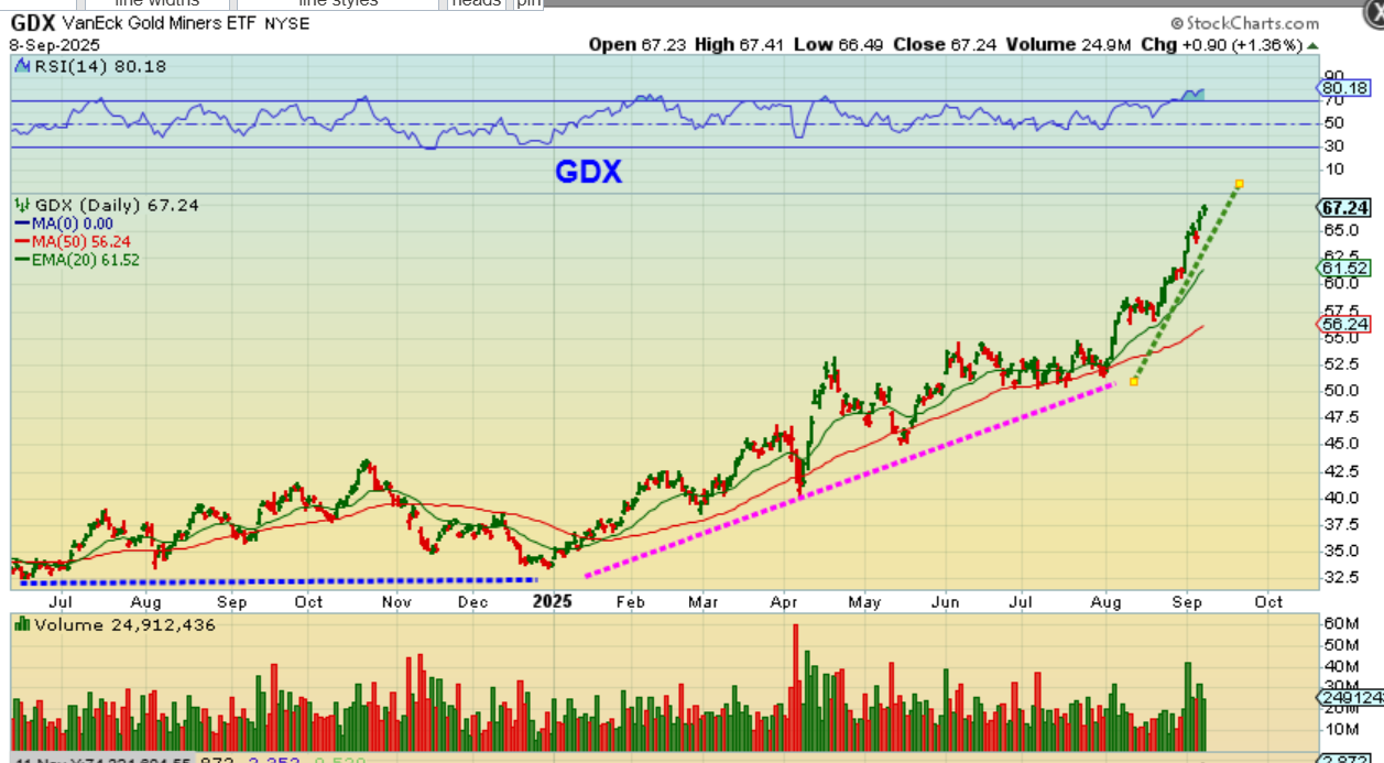 And then I look at these Miners leading the way. The GDX is running strong and many individual stocks are running strong too. They usually need a rest, and a dip into the Fed would be perfect since the Miners are overheating, but a bull can continue to surprise to the upside and just flag or consolidate here and there on the way.