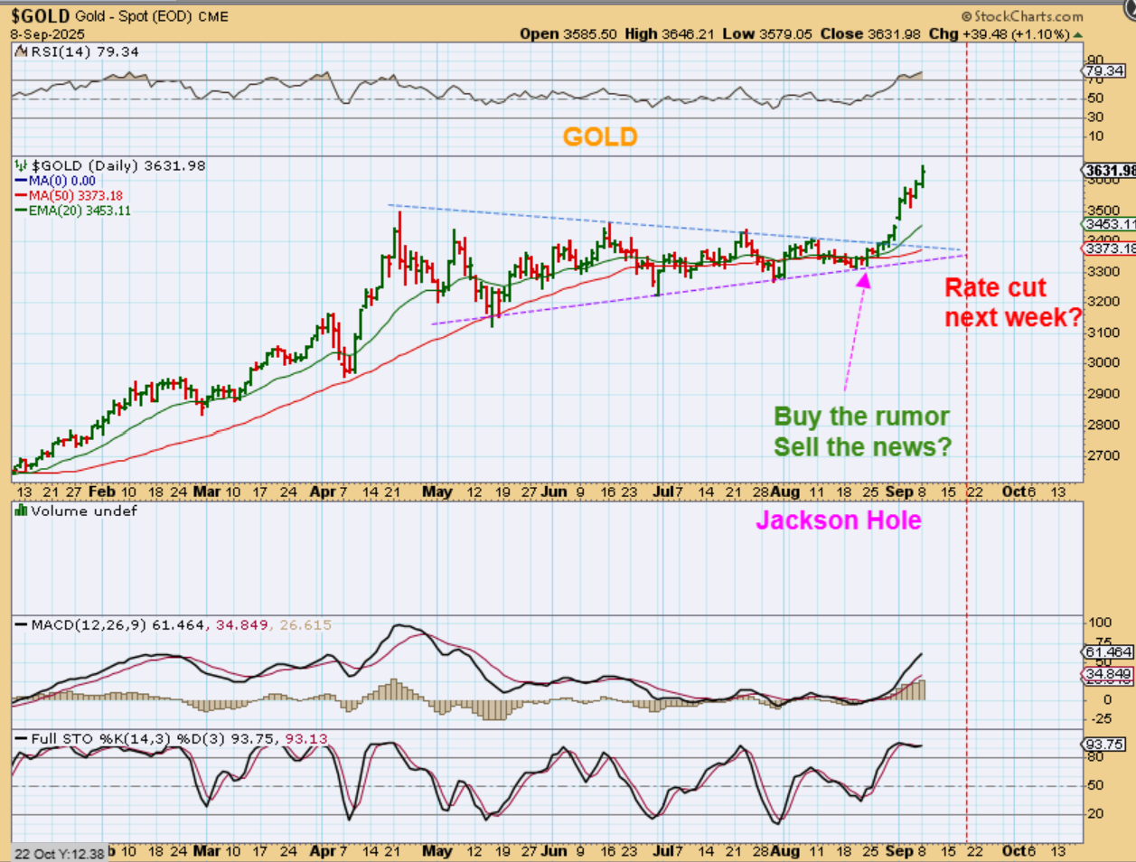 The GOLD rally continues after breaking out from that large triangle. This started to breakout after the Jackson hole speech discussed rate cut possibilities. It’s not worth guessing when this could pullback, but I wish that it would dip soon rather than do a blow off top. To be honest…