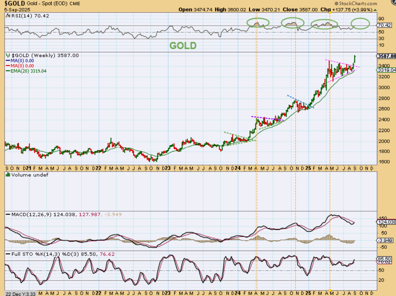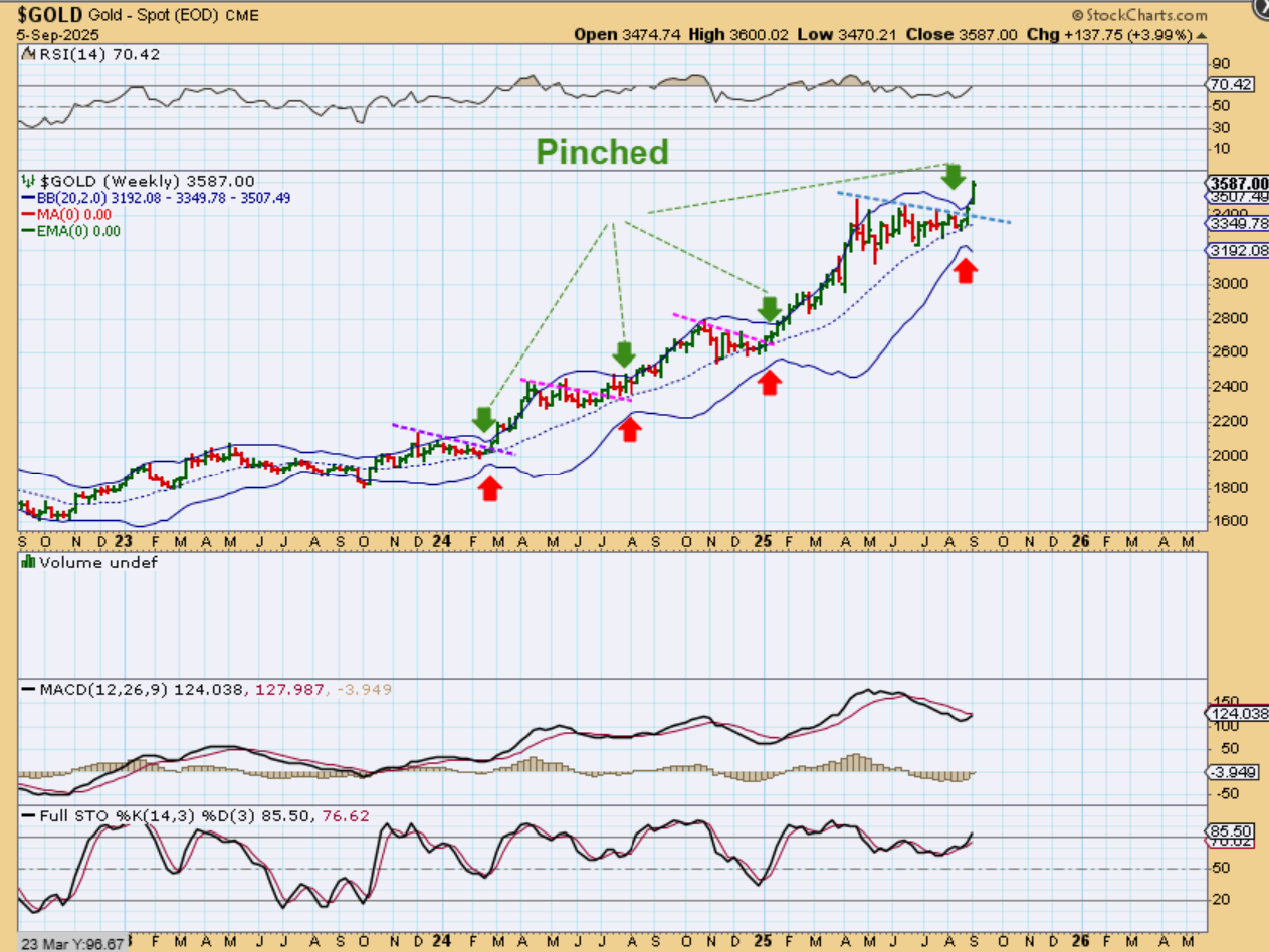 GOLD had a B.B. pinch that is now opening up on a weekly basis. It is a reset of sorts and now it looks that Gold will go beyond $4000+ (over time).