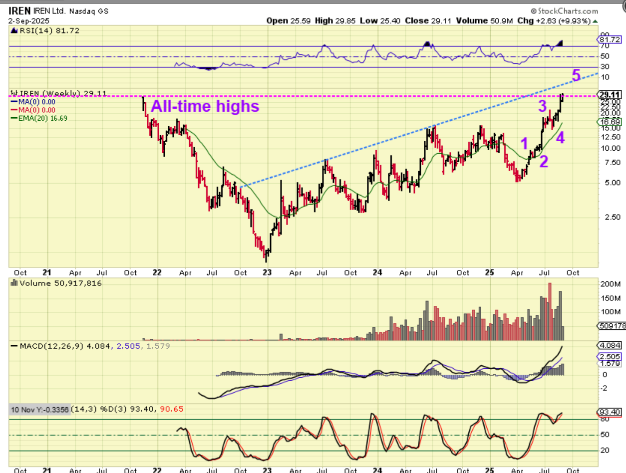 No back-tests and take note of the RSI when the rally ‘peaked’. The RSI & Stochastics have cooled off and now have room to go higher before a peak. With a Bull market that has this triangle, it would seem that we have an ICL. Holding positions is prudent, even if you sell some on the way higher, but I see 1 tiny problem…. The small problem on this is that some Miners are starting to look parabolic. I’ll discuss that too.