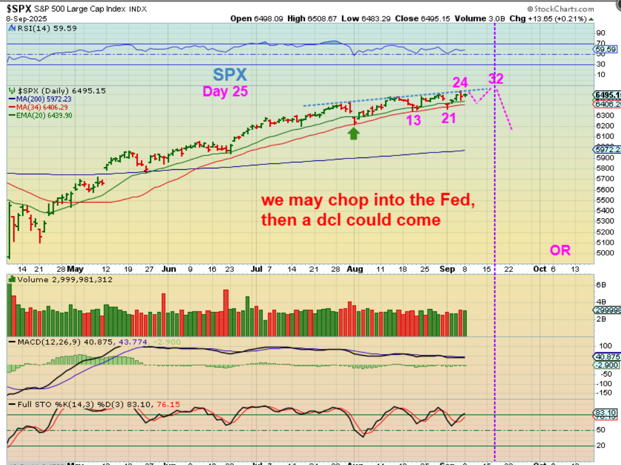 SPX – The markets could even rally into the Fed meeting and beyond with a 50ish day daily cycle, and then roll over into a dcl. Honestly, both ideas are bullish.