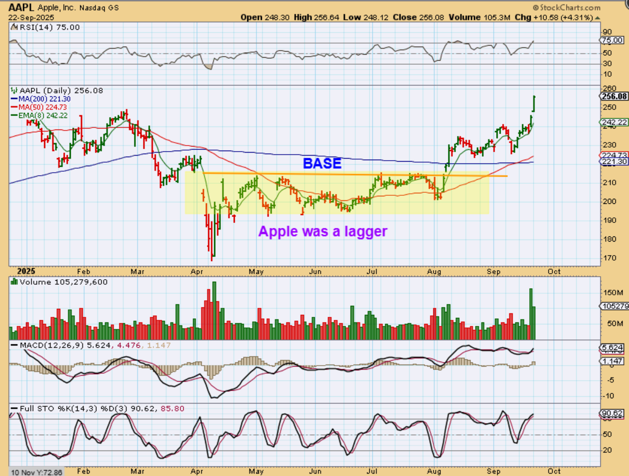 AAPL -In August I mentioned that AAPL was a lagger (other stocks like MSFT, NVDA, GOOG, etc. were back at the highs). It was now breaking out so it could run back to the highs as a buy and hold. I mentioned buying a back test or dip & riding it.