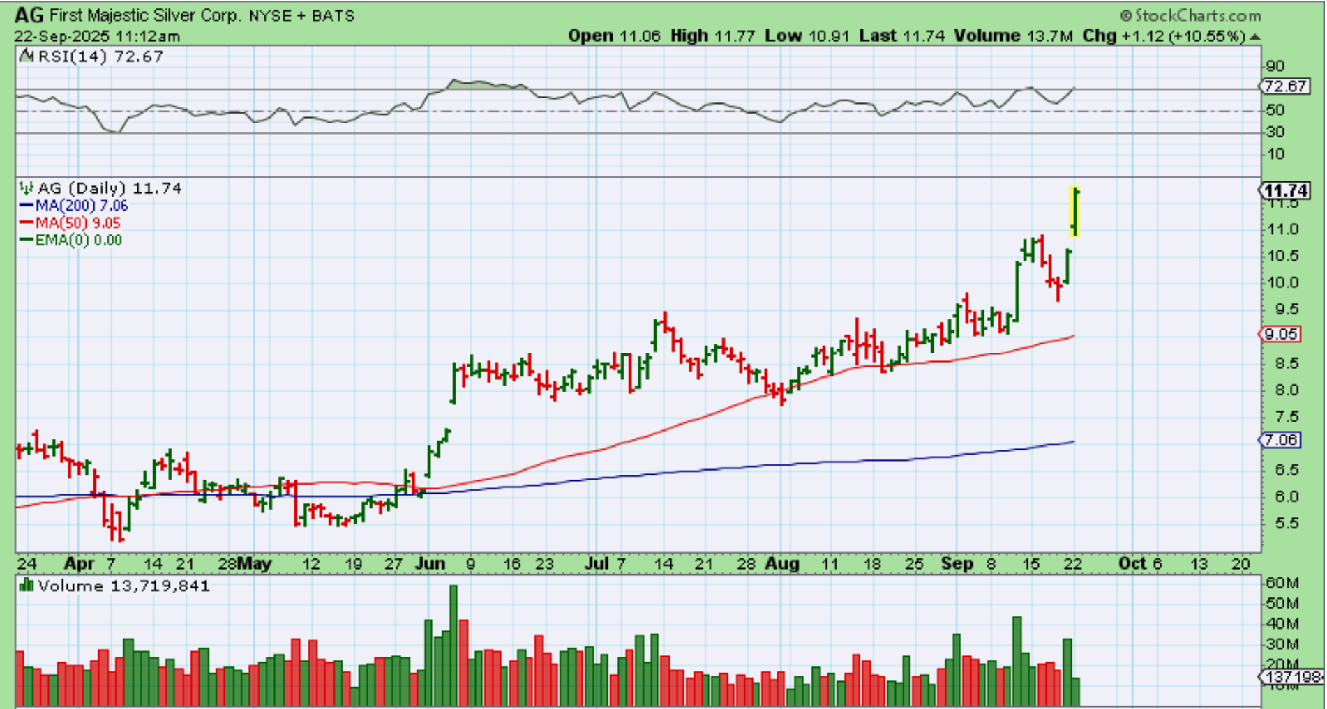 AG was lagging as it literally chopped sideways from June into September. THAT was frustrating, but it looks to be taking off now. Here it was up 10% in the morning and it closed up 14%!
