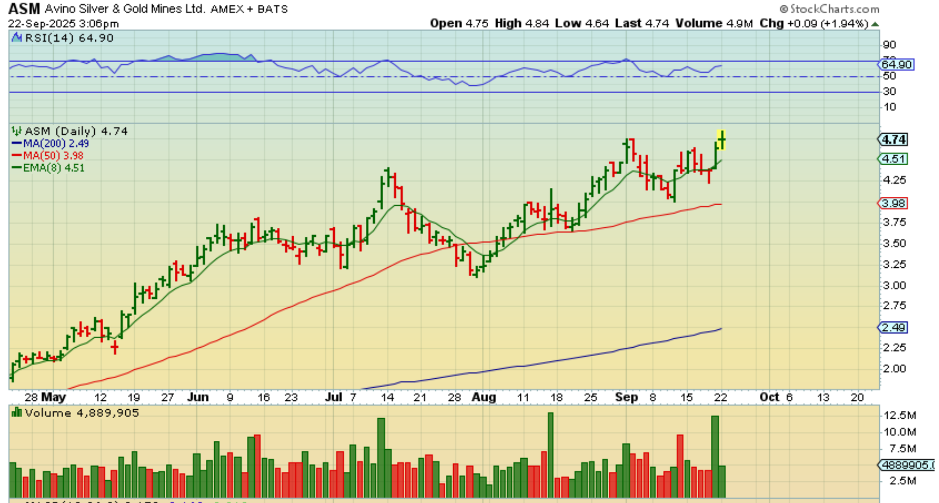 ASM looks to be recently lagging here. It did actually have a great run in April into July, but it paused and formed a cup of its own. ASM may start to run again here.