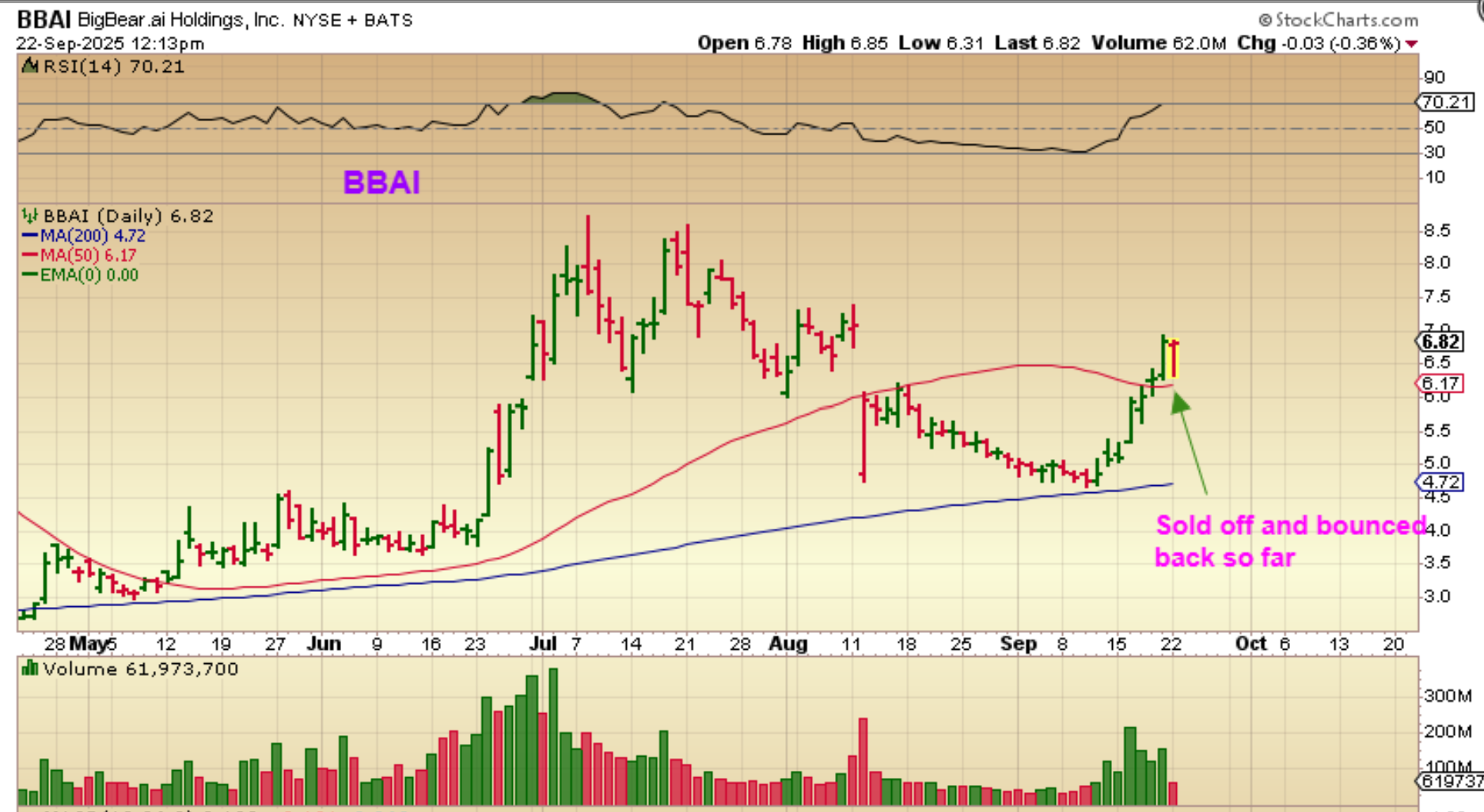 BBAI was a buy for us at the reversal near the 200sma. It then broke through the 50sma and yesterday it dropped and bounced back, and that…