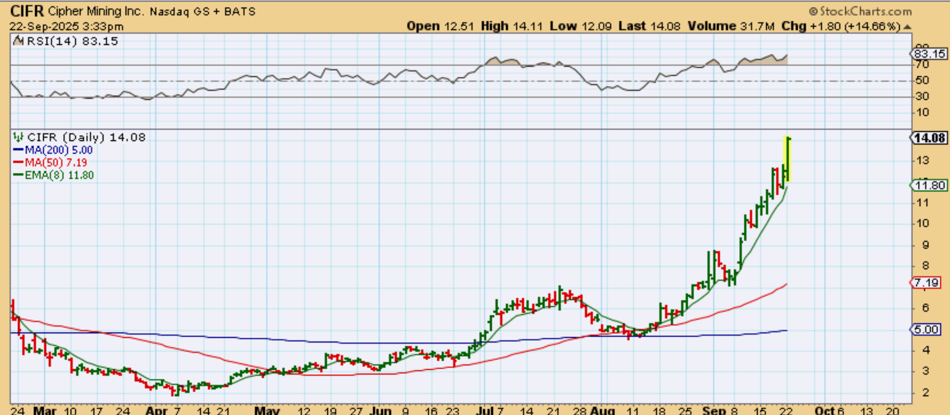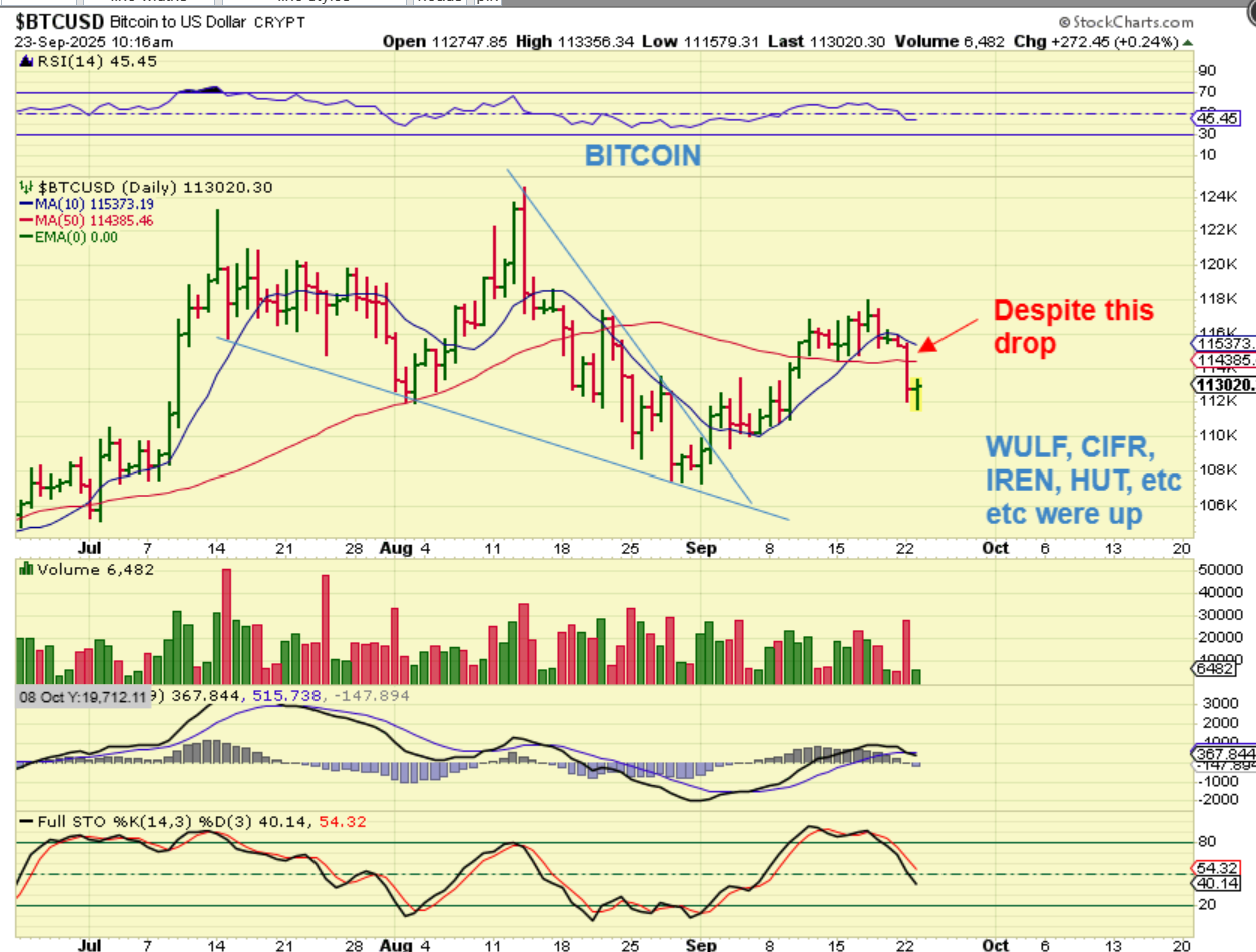 CIFR was up another 15%! THIS looks like it may be getting extended, but it just continues to climb higher on an almost daily basis. This also went from red to green and then rallied despite Bitcoins drop.