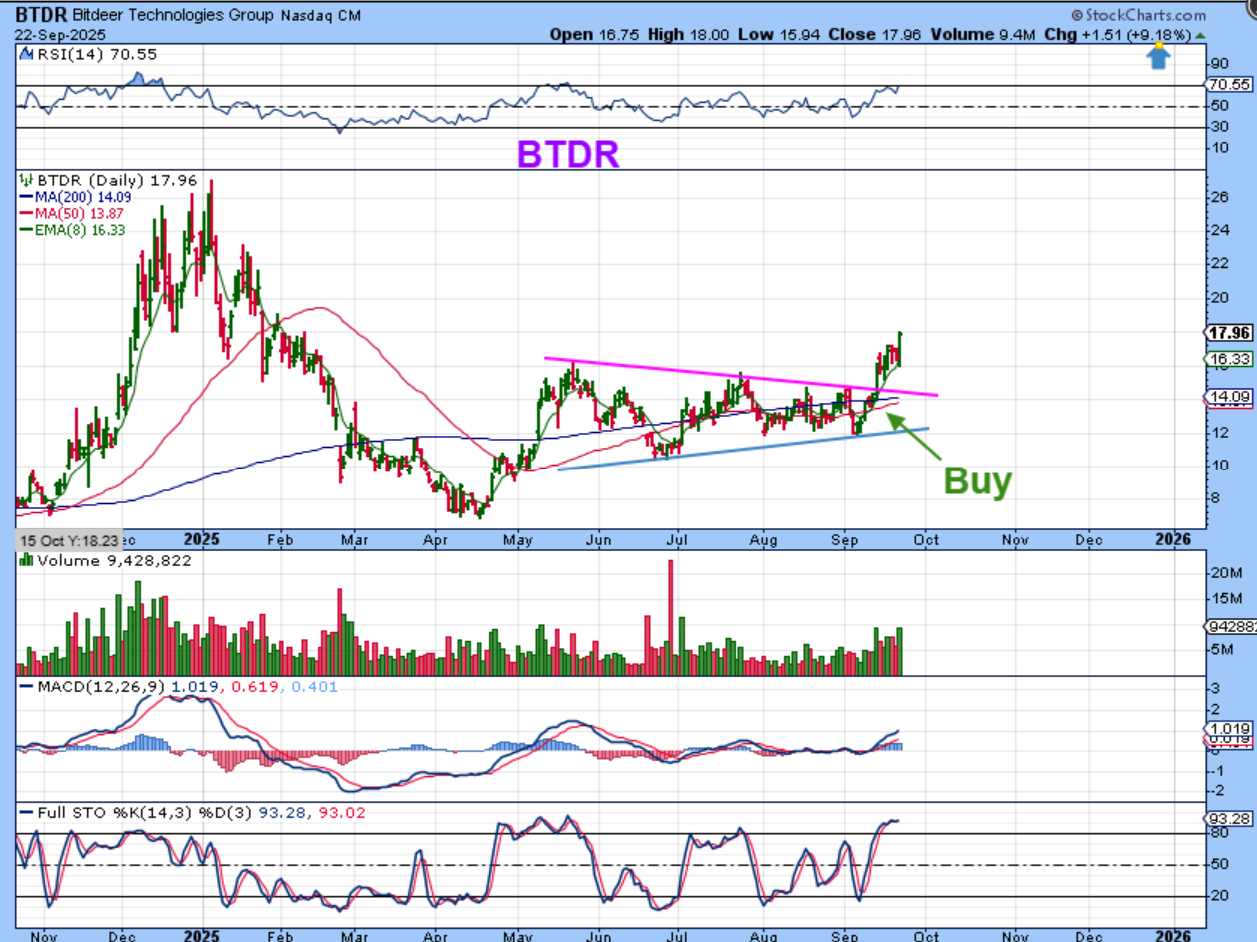BTDR was a buy in the apex of the triangle consolidation, and it continues higher. It was up 9% on a day when Bitcoin was down and I think that this can continue higher too. I mentioned that it can run to former highs at $26, especially since it is not overextended.