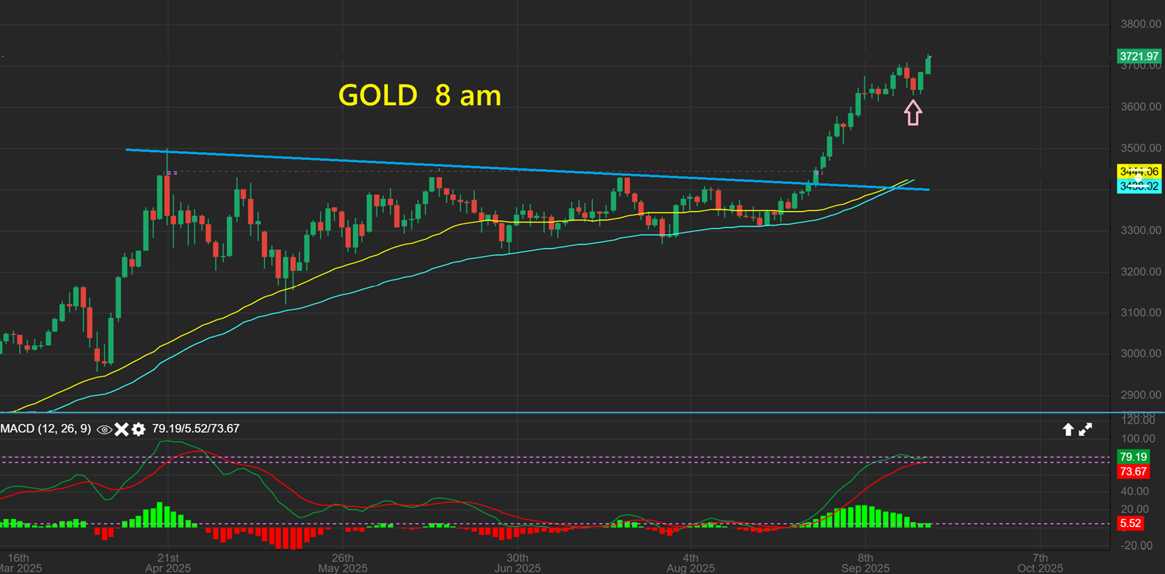 GOLD was up at 8 a.m. Monday, so I grabbed this chart and it could be day 2 of a 2nd daily cycle (ICL in the tringle). $3721 and a new all-time high.