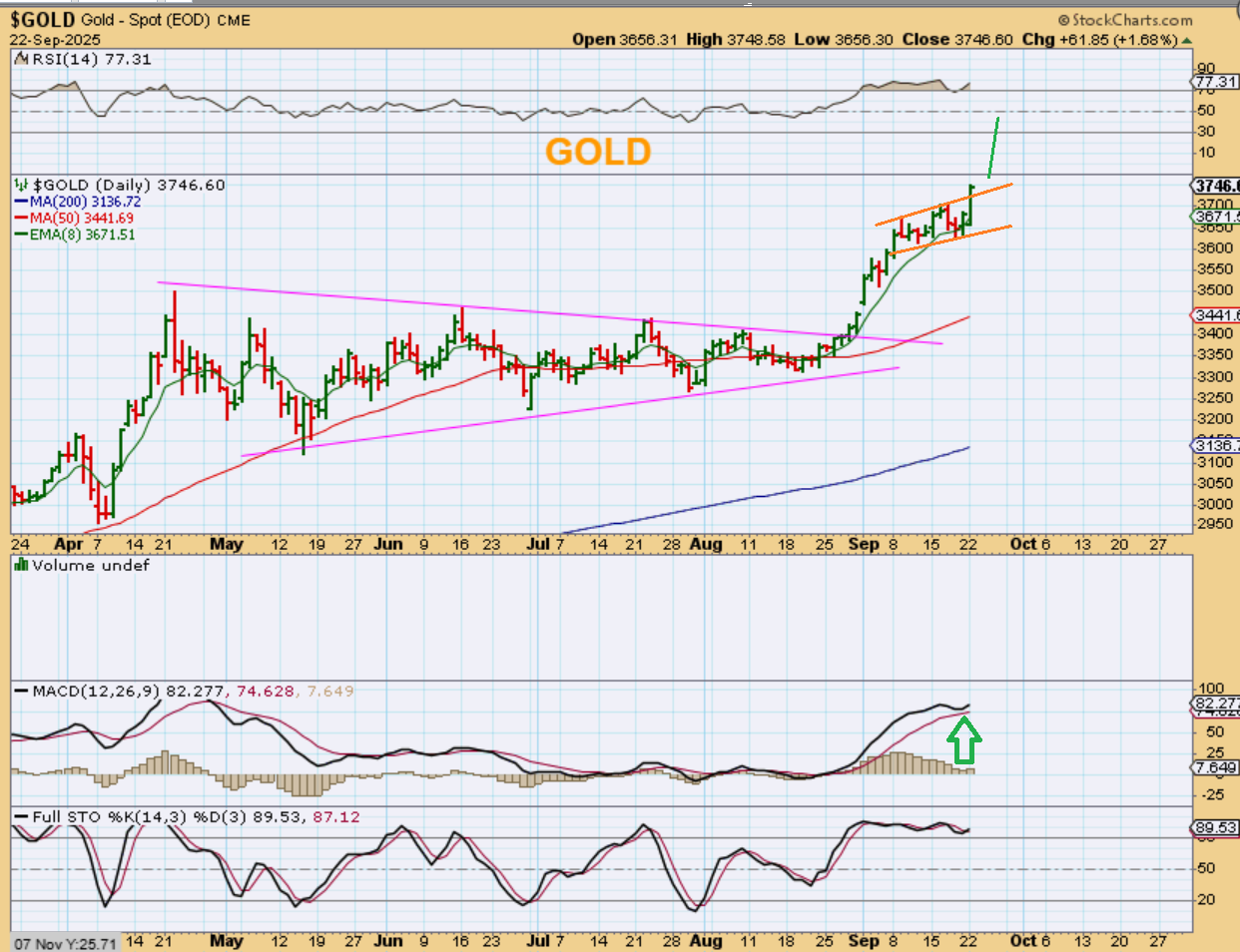 GOLD stretched to a new high of $3748 and with a bull run this strong following a 3-4 month triangle consolidation, this can stretch higher. It also just put in a smaller upward sloping churn that can build more energy too.
