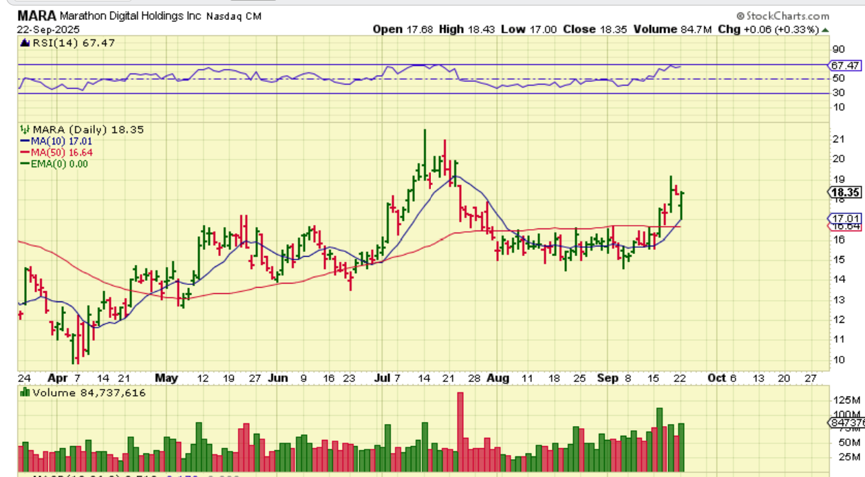 MARA – I have pointed out the laggers (The best ones to me were MARA and CLSK). CLSK took off higher and MARA looks to be set to run too. It dropped BIG yesterday, but buyers stepped in again, so it closed up 6 cents. This could be bought, especially if it starts to run from here.