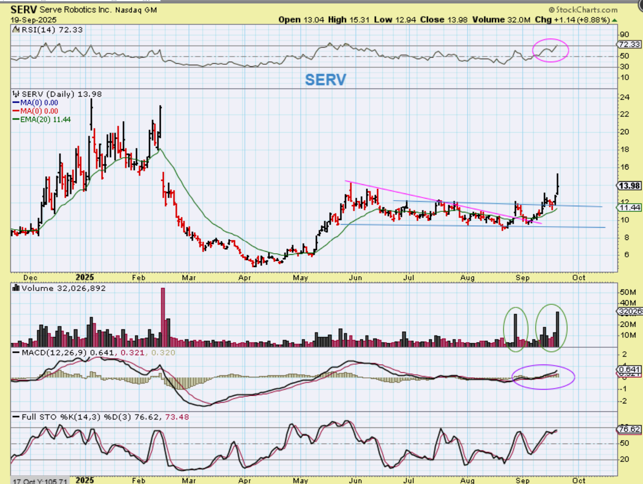 I like SERV in the robotics sector. You’ve seen what RR did, and this may follow that kind of move. This chart was from Friday and on Monday SERV stalled here and closed slightly down at $13.75. It could be a buy if it drops lower or it may be a buy here too, but it does swing rather big.