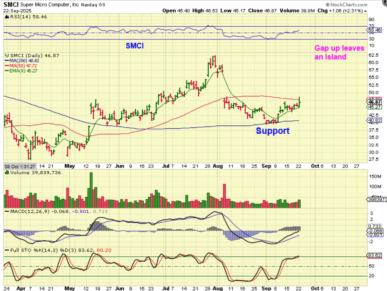 SMCI – I remember when I traded this, and it was a very strong stock. It has now dropped to support and is slowly climbing upward. I think that this is a buy right here if you need a stock to trade, or you can wait for the breakout above the 50sma. I will admit that this has been a choppy stock, but it is moving higher. .