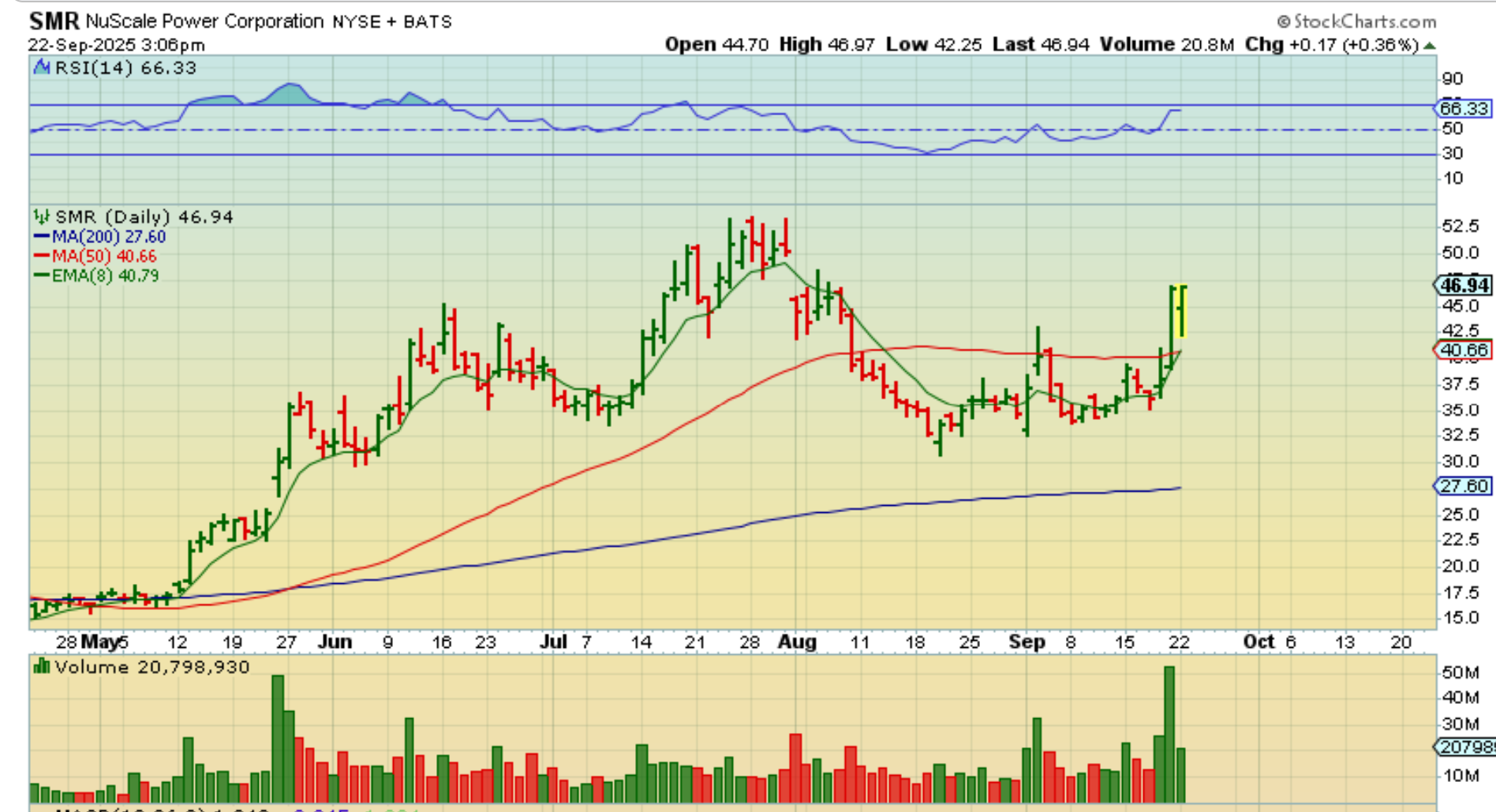 SMR was lagging OKLO last week (obviously) when it suddenly Popped on Friday by 22% over the 50sma. Monday it gapped lower and recovered by 3 p.m., so I grabbed this chart. It actually sold down into the close, but…