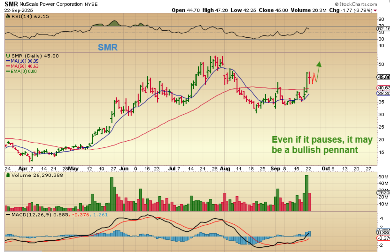 SMR actually sold down into the close, but it may just be pausing or even ‘flagging’ before running higher. SMR can continue higher to form a cup or just rally to new highs like SMR.