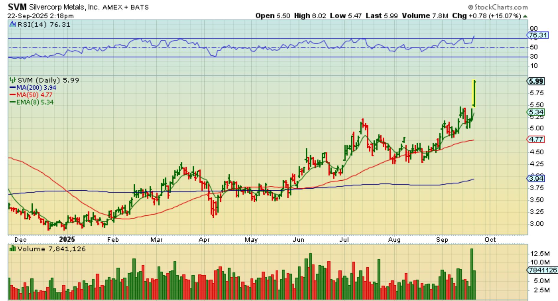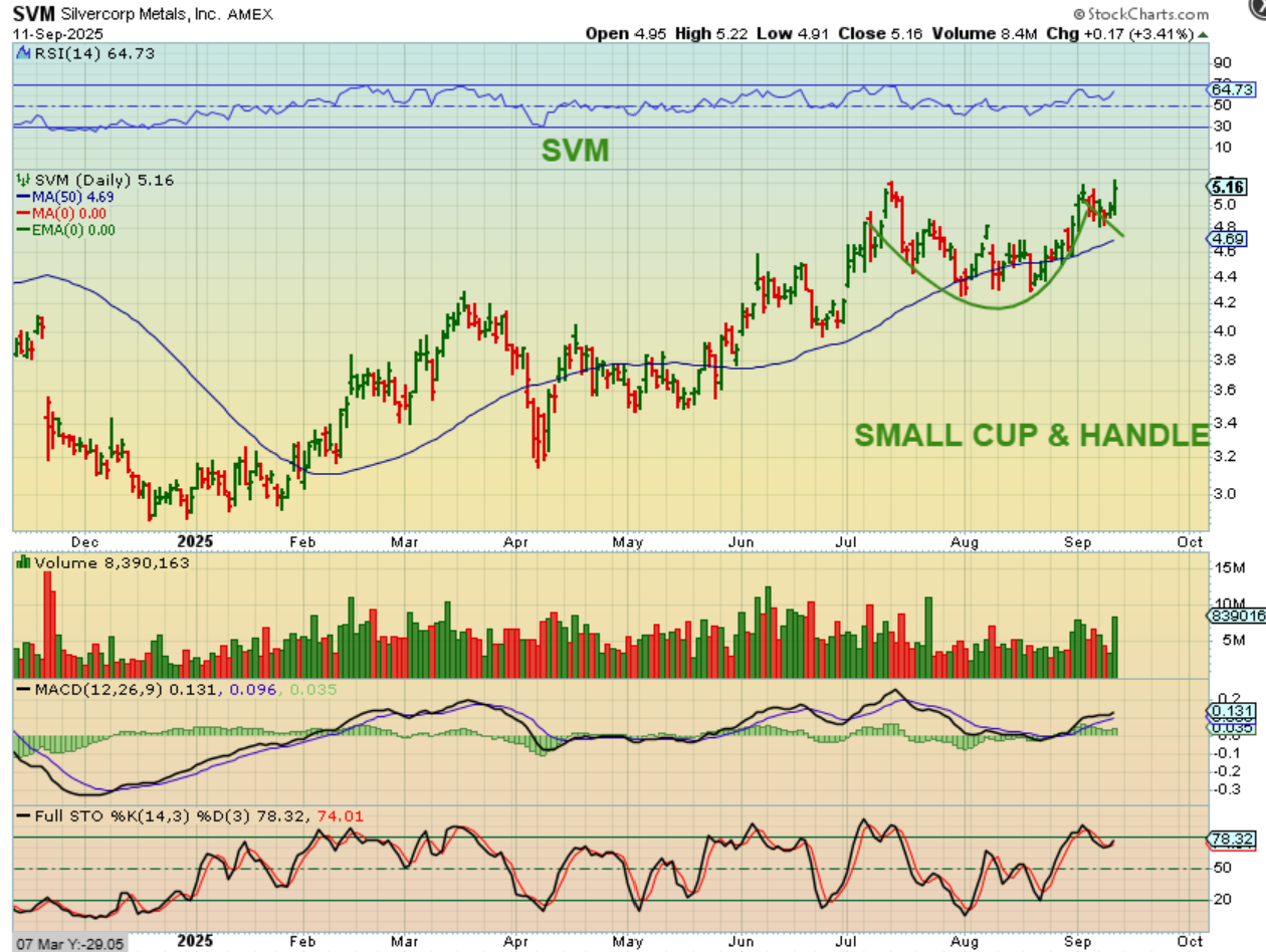 SVM was up 15% at 2 p.m., so it has done well since I pointed out that cup and handle, so now we may see laggers really run. When we see a lagger like EXK and AG start to stretch out, a week from now they may be nicely higher. And with that thought…