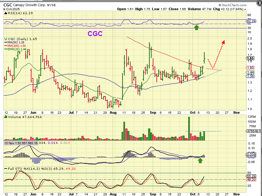CGC – popped and was up over 10%, but then sellers took profit. I actually think that this will drop and fill that gap before moving higher, but so far the set up remains bullish and the buy near $1.40 is in the green.