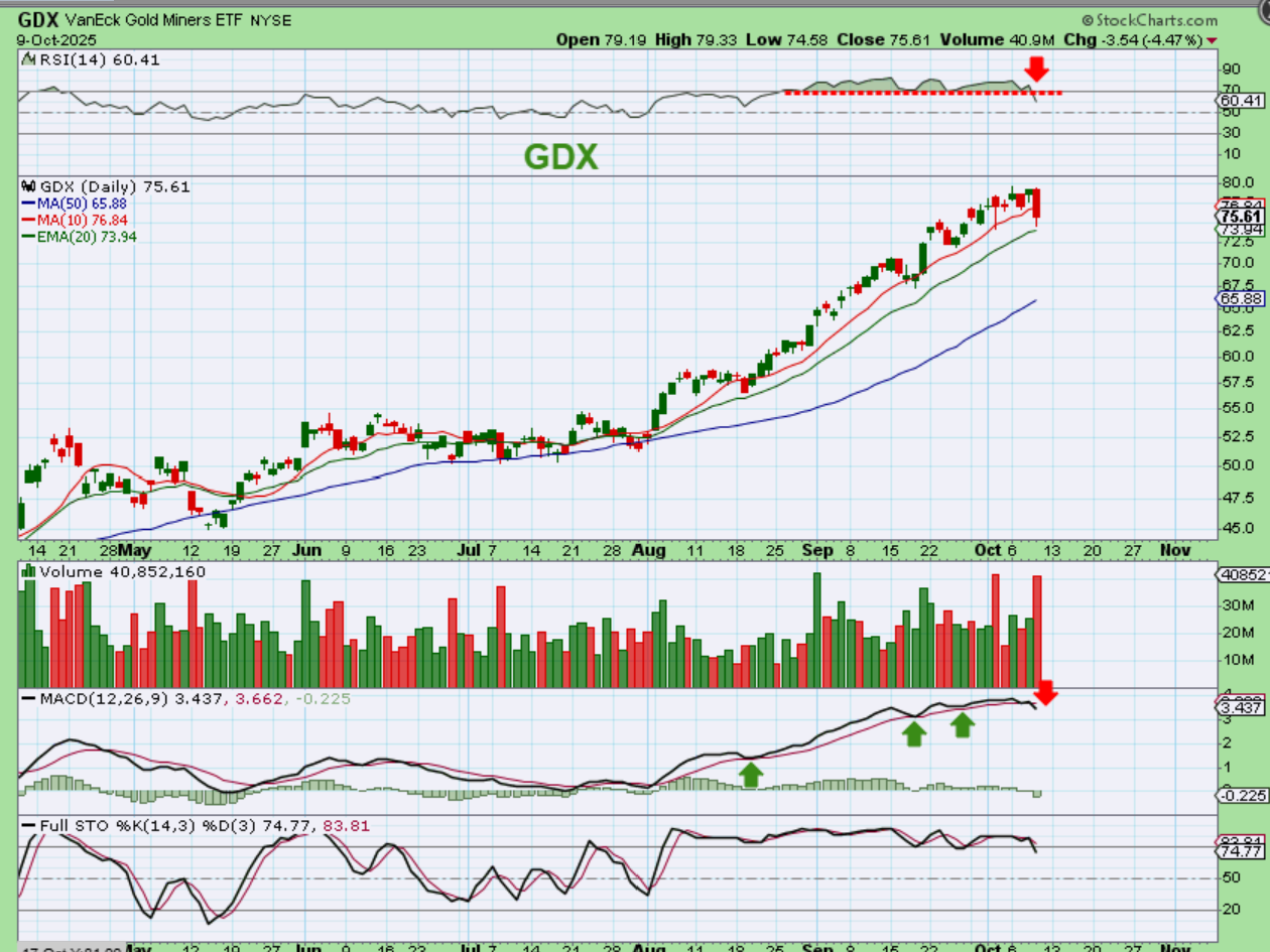 GDX dropped over 4% yesterday, and notice that the RSI broke the 70 area for the first time in over a month, so it too may be starting to slow down and chop or dip toward the next dcl. We also see a MACD cross and high volume, so it does look a it different than what we’ve seen lately. It is only day 15 and if we were to get a 32 day dcl, then this could also show up as a half cycle dip and just start more choppiness, but that RSI caught my eye.