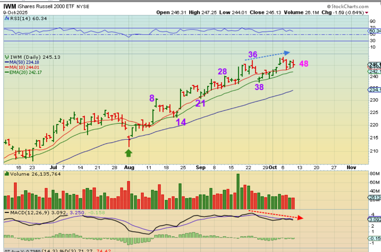 Well, they still do, and I see many charts bullishly set up in the general markets, but at this time I am also starting to take note of the ‘timing’ and small signs of change that may be showing up in both the general markets and precious metals. The Charts are still very bullish, but using the IWM chart for cycle timing, I showed in todays report above that we hit day 48 out of the dcl. That means that a dip into a dcl is coming due. Maybe in the day 55ish area. That being said…