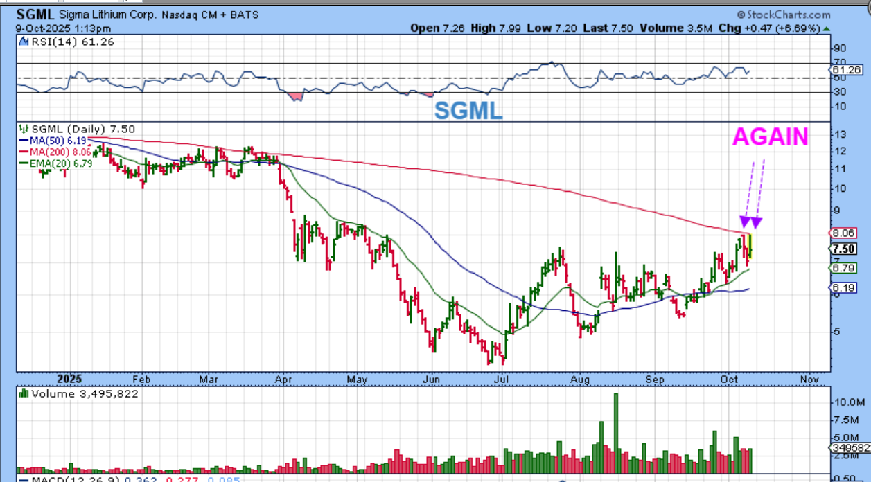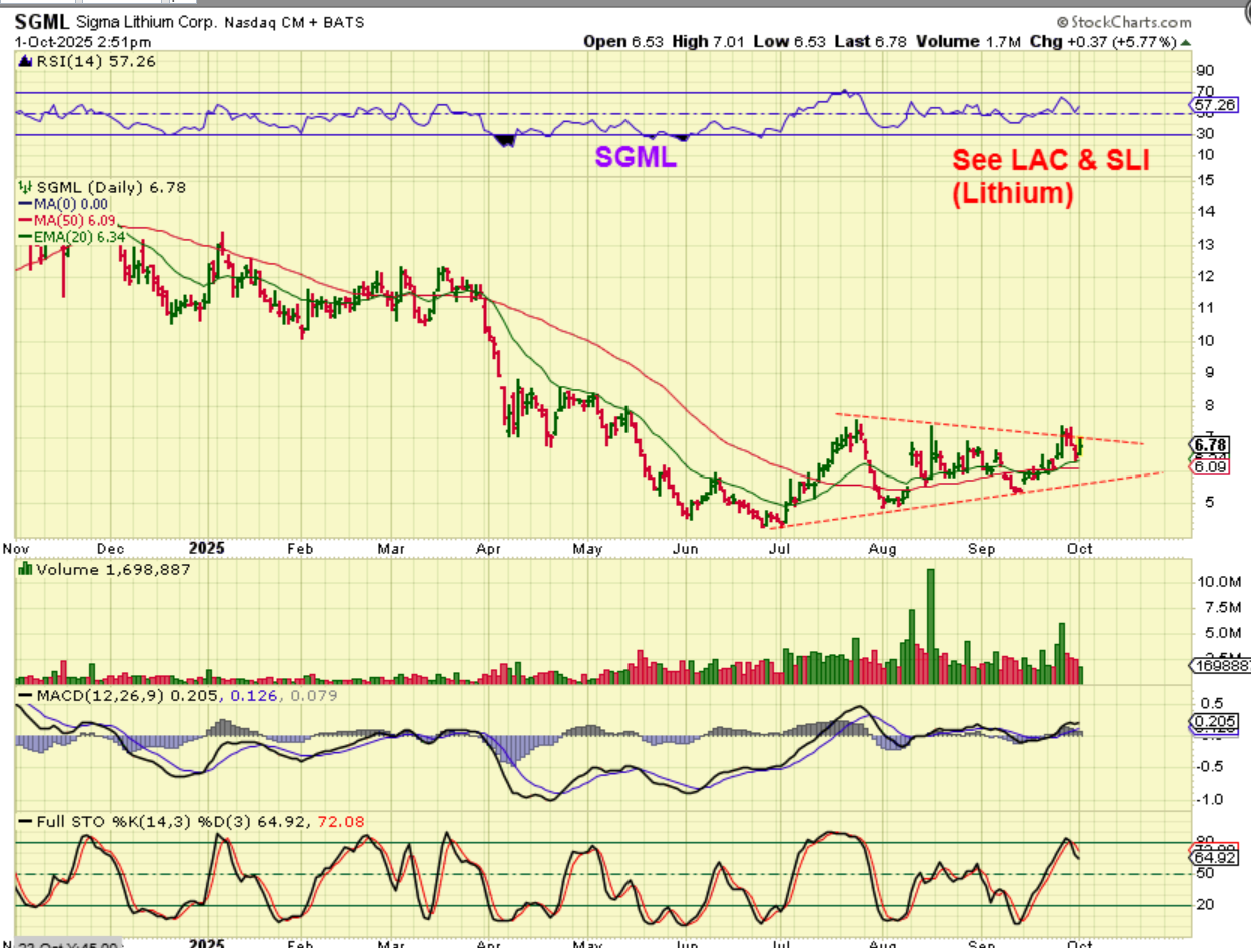 Update: On Oct 1 I pointed out SGML as a lagging Lithium stock. I used this chart when it was breaking from a triangle at the $6.75 are…