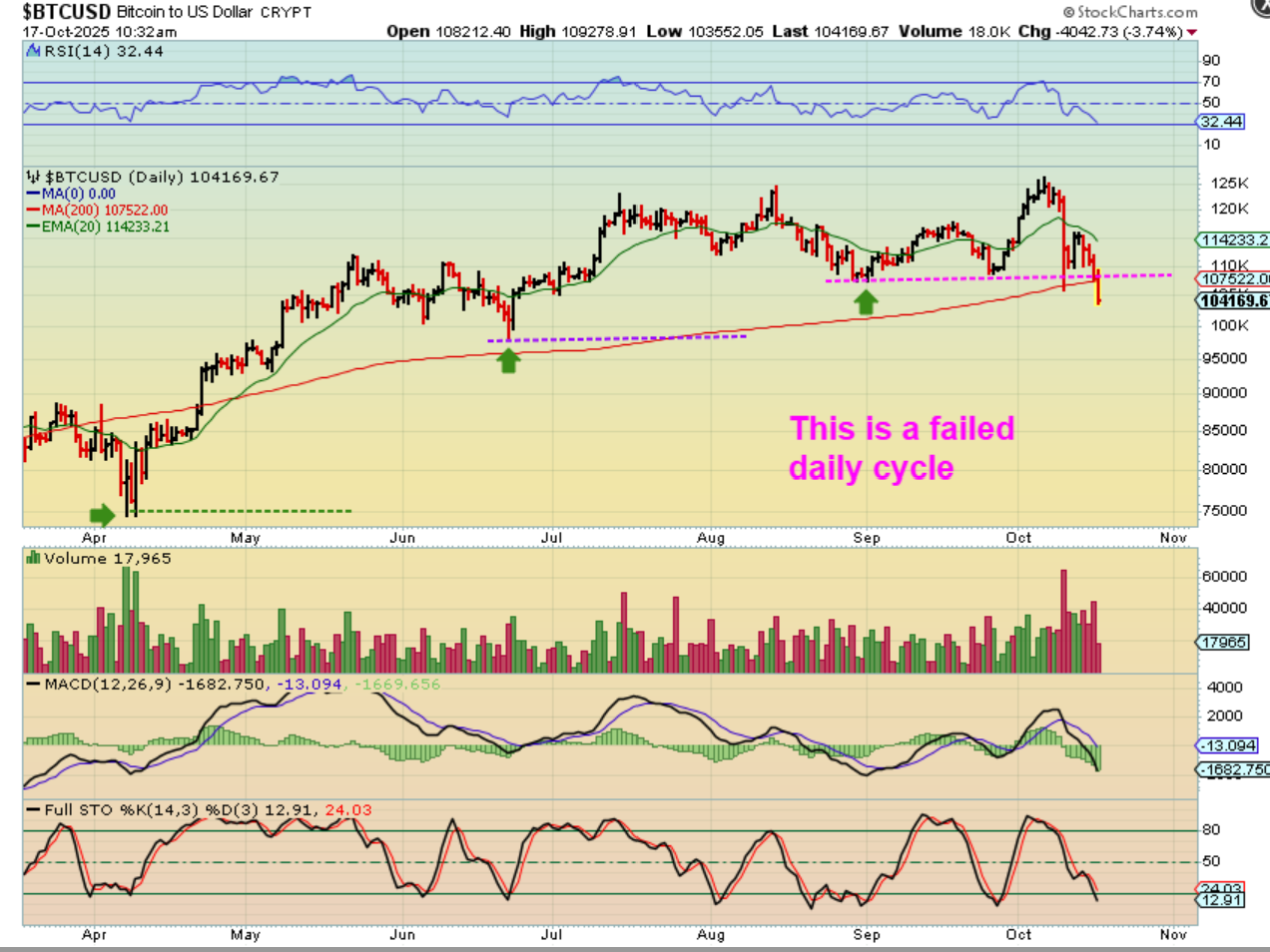 BITCOIN – The way I look at Bitcoin using cycles, this is a ‘failure’, because it broke the lows at the last green arrow (and it also broke the 200sma as a sidenote).  $98,240 is the 2nd green arrow from the June low and it could even take that one out before this daily cycle is finished, unless we bounce first…