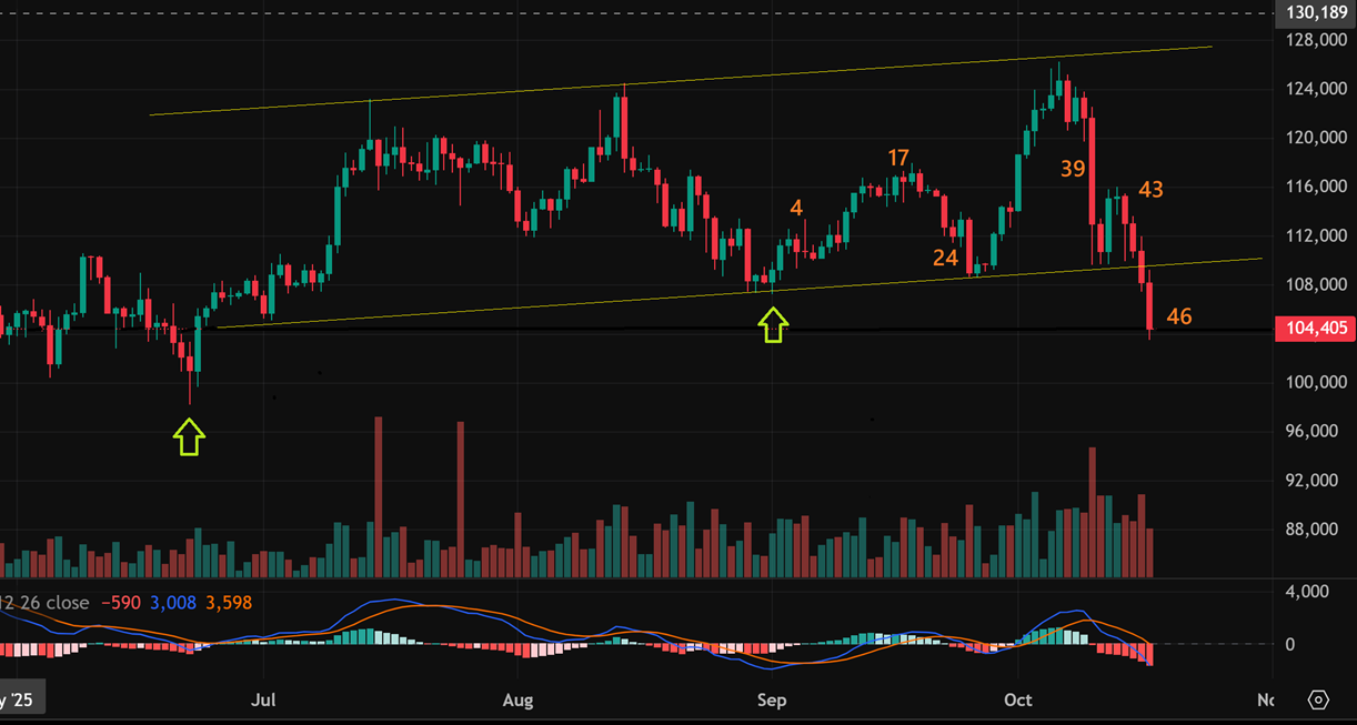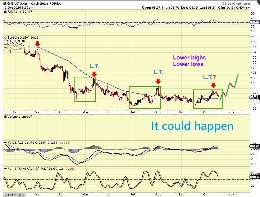3. Do you recall when I said that we are in the 3rd year of a 4 year cycle and I see weakness? I was still hoping for 1 more run to the upper blue line, the $150,000 area. Now that hope is fading. We will have 1 more chance after this day 60 low is in place. I’ll discuss that in the weekend report.