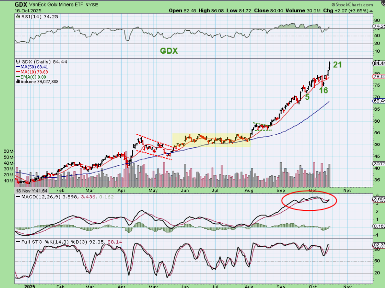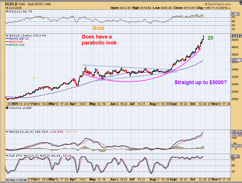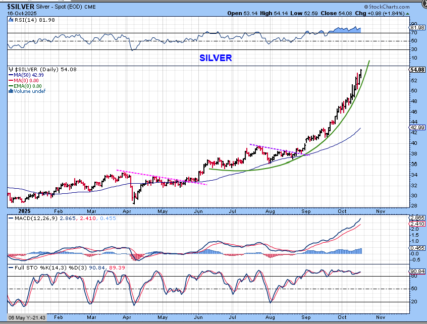 SILVER was choppy, but it has become a bit tighter in its run higher. I already showed these charts in the weekly report as going parabolic, but the question was: Do we get a dip and a final run, or is this a final parabolic run? I have been monitoring it, and I’ll continue watching, and you may remember what I’ve already said…