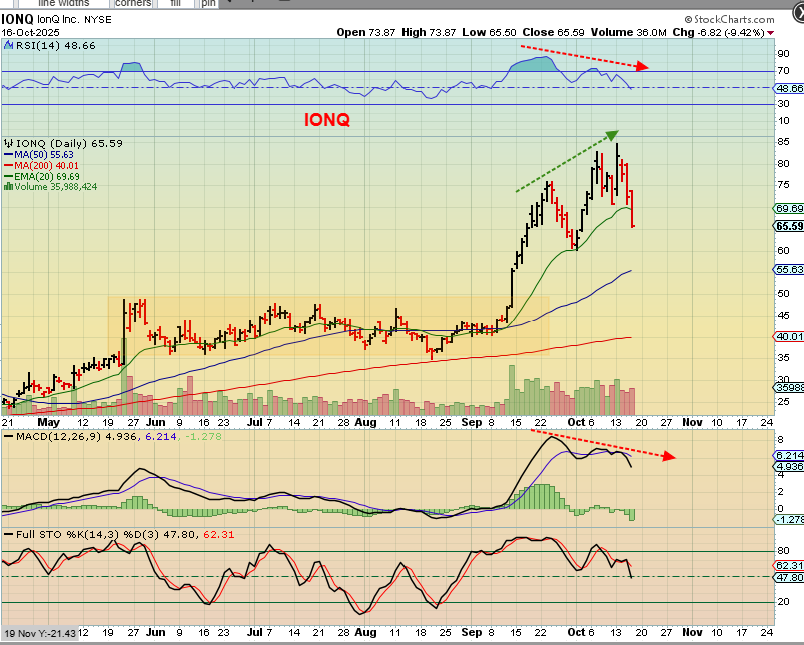 IONQ – I’ll be honest with you, this does not look good for several reasons. It lost the 20ema, the RSI did not confirm strength in the new high and the MACD also showed me a lack of momentum. It ‘Could’ bounce if the markets do, but I think that the highs are in for now and it may just become choppy. It actually looks ready to drop to $55. I’ll be watching this for more clues as to what may be happening.