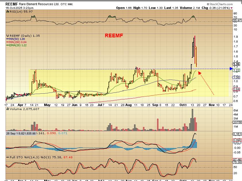 REEMF is an example of a breakout and POP higher on Monday and Tuesday. Wednesday and Thursdays drop took all of those gains away. Thursday saw REEMF lose 21%. IS this support, will it hold? If it chops as a back test and then reverses higher, you could buy it, but if it breaks down, this ramp up may be over.