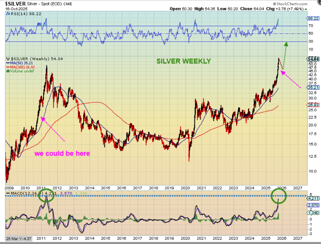 SILVER looks parabolic, but it may resemble the 2010 blow off top where it did go straight up, pulled back, and rallied up 1 more time.  I drew that here. We’ll be watching this area too.