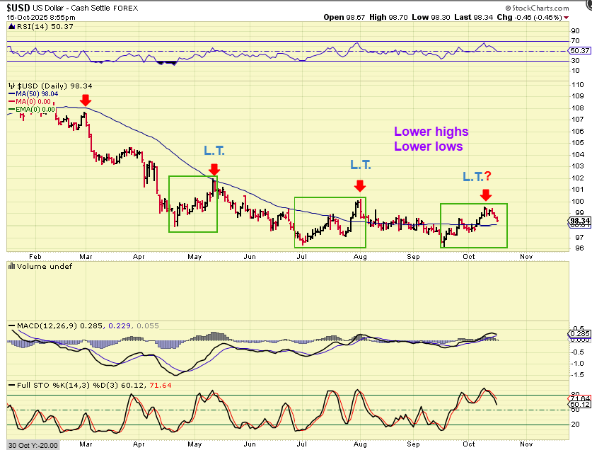 So far, The USD continues to act as expected. At this point it would become L.T. and also a lower high like the last 2 ‘peaks’, but we’ll see what it does at the next test of support, the 50sma. I know that it looks like that drop will repeat similar to the last 2 L.T. Peaks, but …