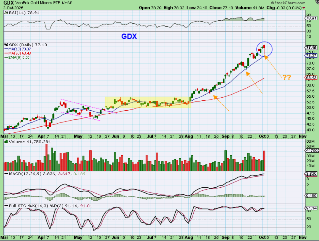 GDX – I know that this looks really bullish, kind of like, “Wow, the GDX sold off and had the strength and buyers to make it right back up to the high!“. Right?  Well actually, that is a topping candle in most cases, so let’s discuss that…