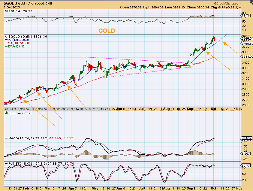 SILVERs incline is getting steeper, but it also may be flashing ‘topping’ candles. A mild dip may only tag that 13 sma here too.