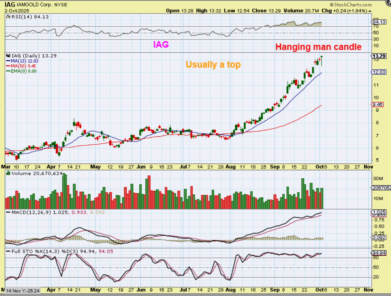 Now I look at a Miner like IAG and I see that it also has a ‘hanging man candle’.  It won’t take long to see if this plays out. It is a very bullish looking recovery from the selling yesterday, but it should be down on Friday.